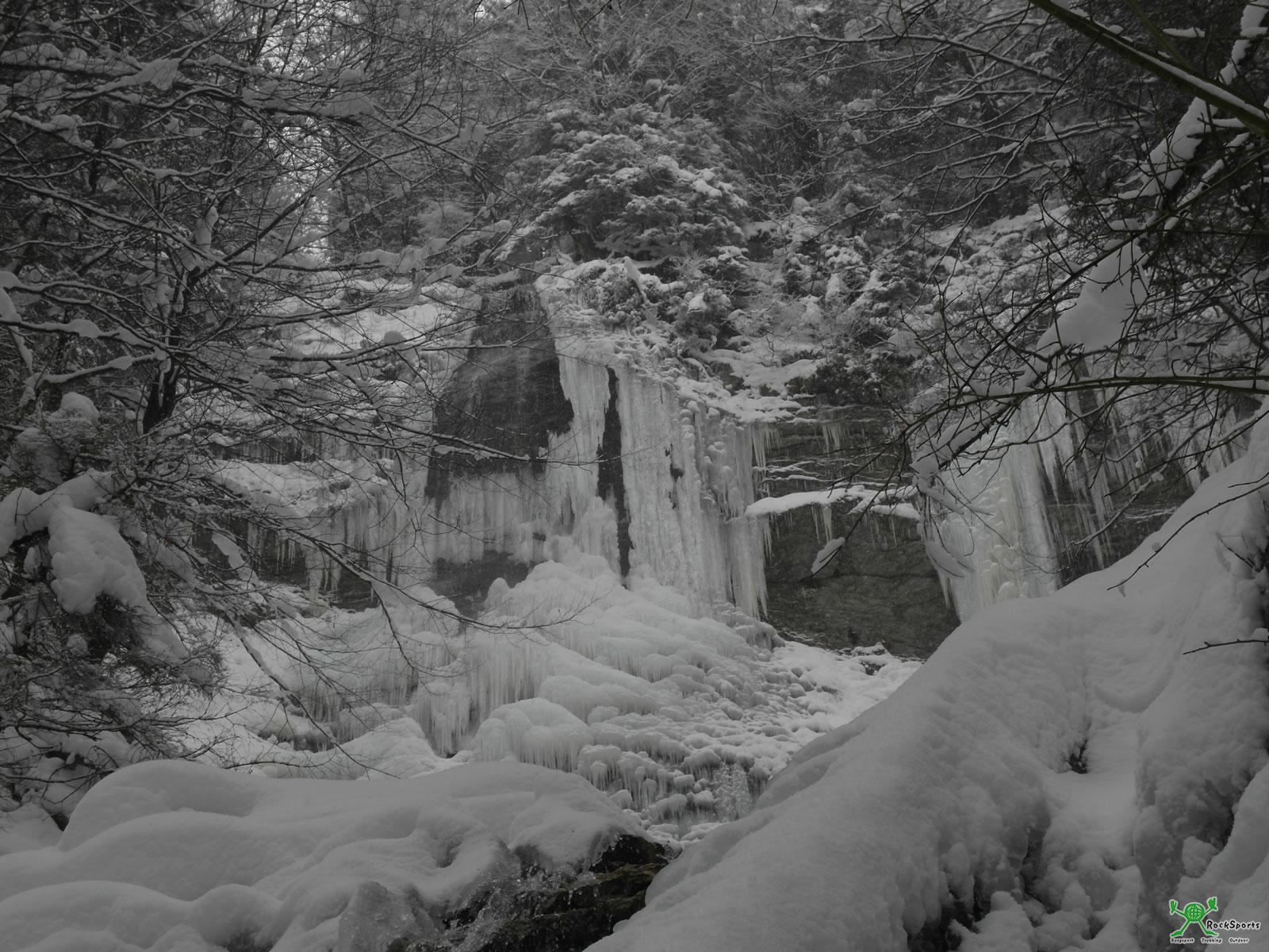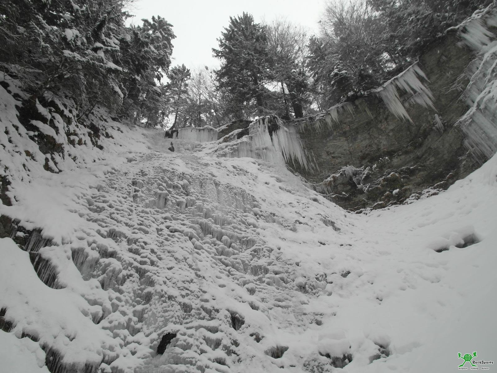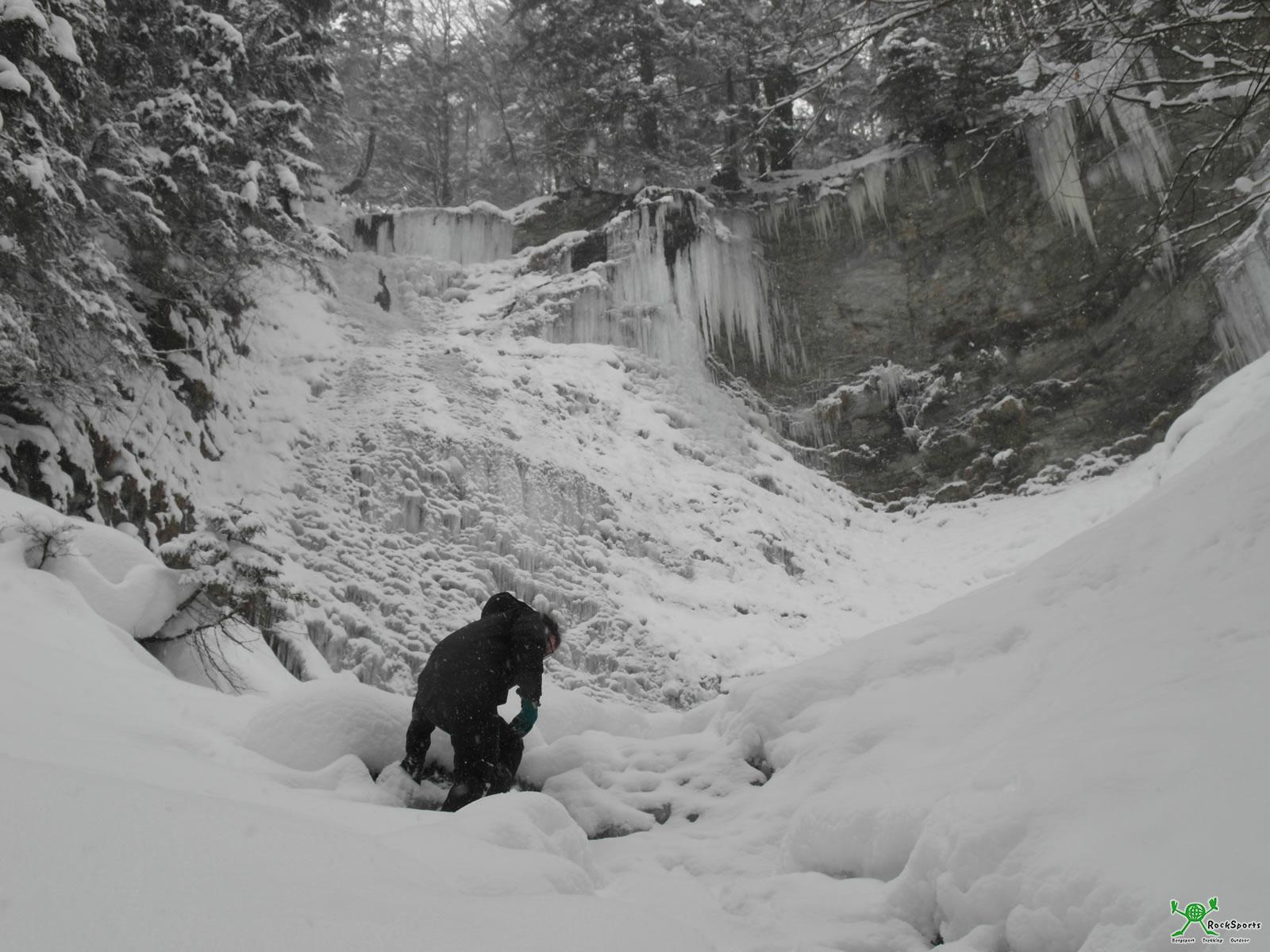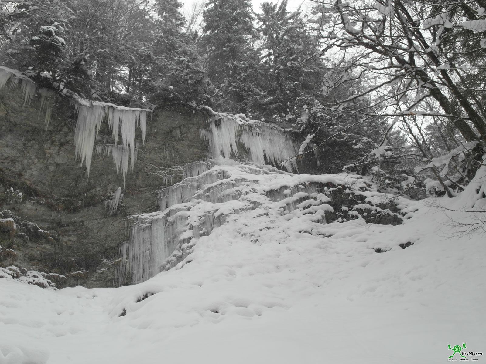Danach erkundeten wir die versteckt in den Seitentälern gelegenen Fälle noch. Hier bot sich uns ein trauriges Bild: Es baut sich zwar Eis auf, dieses ist aber noch sehr dünn und unterspült. Am unteren Fall ist in der Mitte ein großes Loch, hinter dem der Wasserfall rauscht.