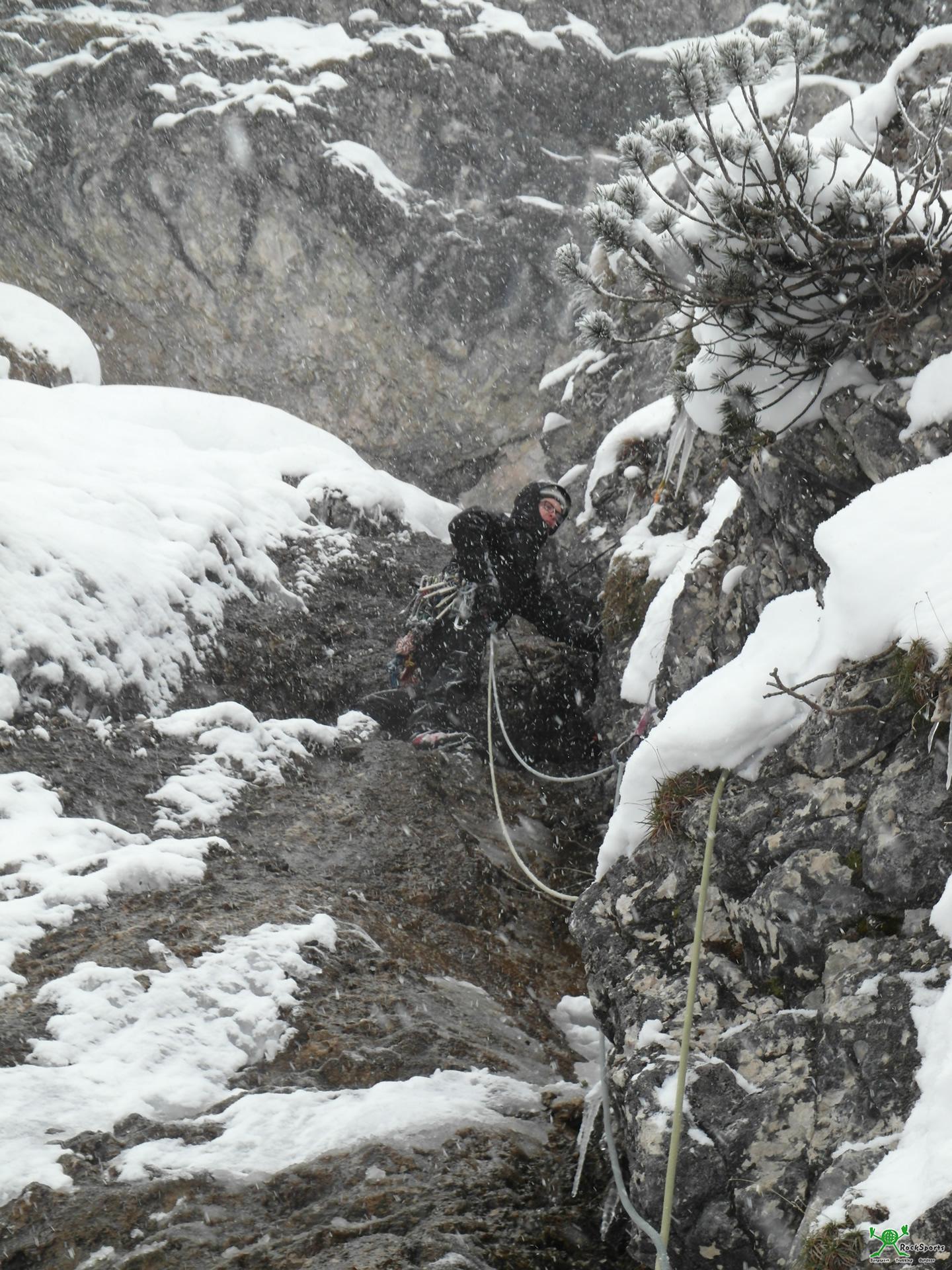 Also sind wir die erste SL bis zum BH-Stand geklettert. in der 2. SL haben wir mit einigen Schlenkern einen Vorhang mitgenommen, danach selbst einen Stand gebastelt. In der Dritten ging es auf Fels mit Moos/Schlamm/Schneeauflage weiter.