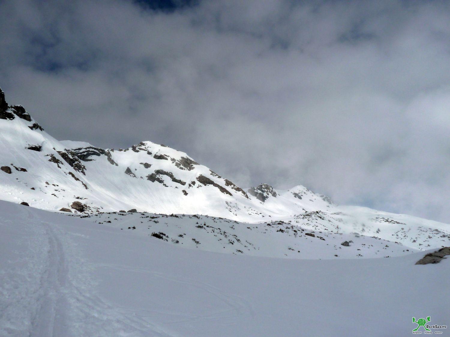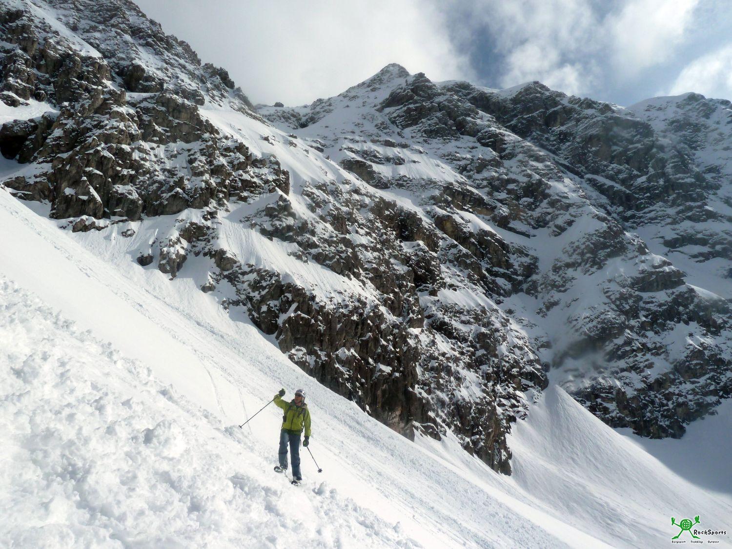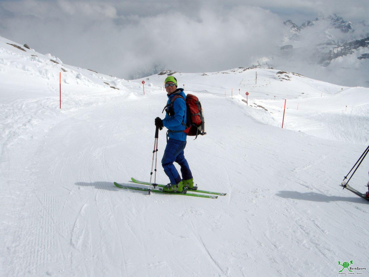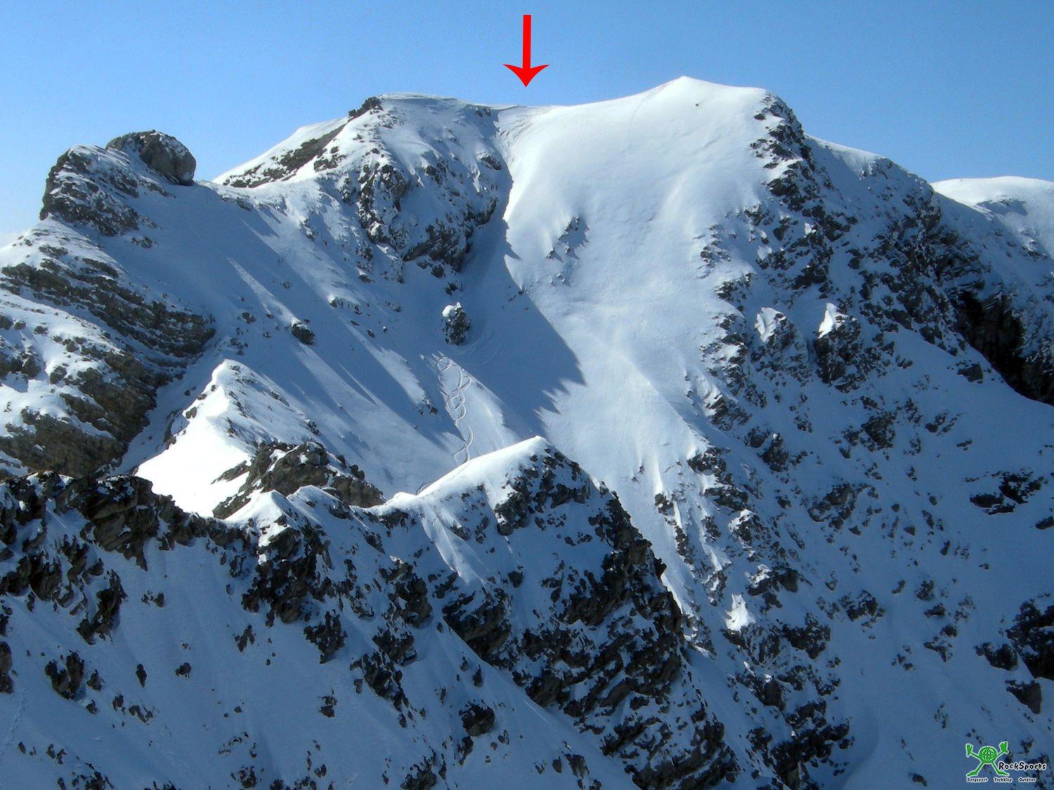 Nach dieser kurzen Klettersteig Einlage geht es problemlos über flache Südhänge zum Gipfel des Großen Daumen (2280 m). Um nun die Einfahrt zur Nordabfahrt zu erreichen bleibt man direkt am Grat und quert rüber in Richtung Kleiner Daumen. Die Einfahrt befindet sich in der Gegend wo der Grat steiler in die Scharte zwischen Großem und Kleinem Daumen abbricht.