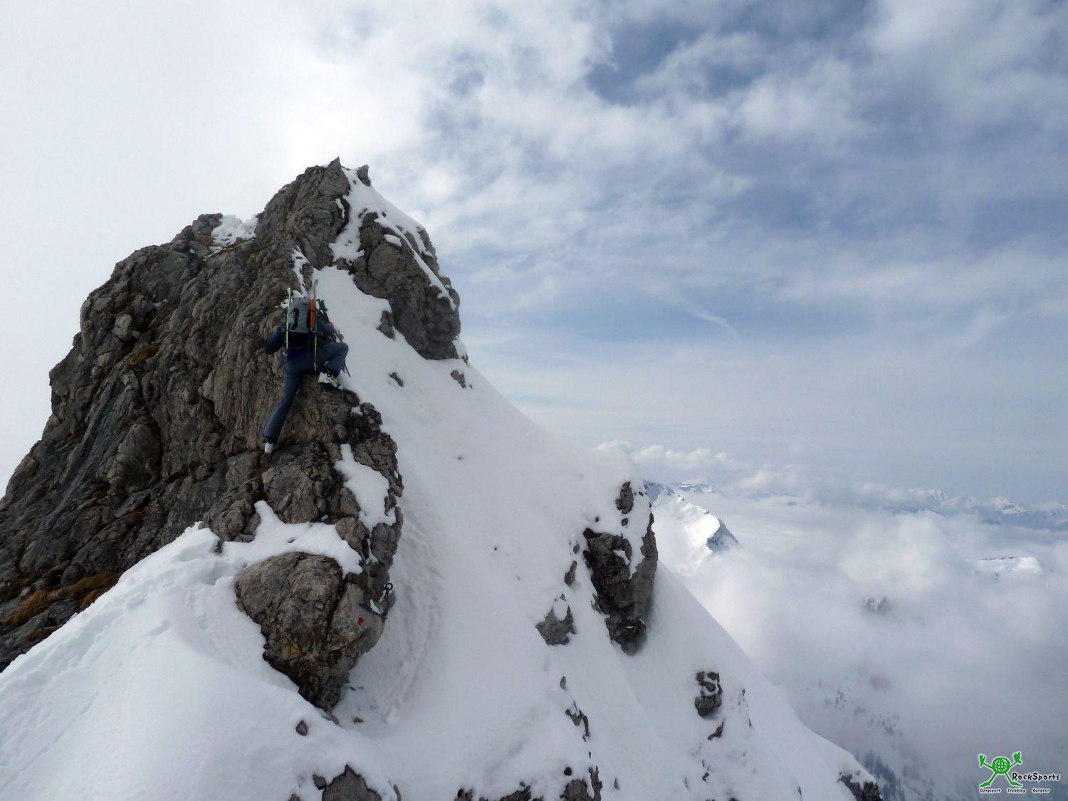 Um nicht ganz so eintönig bis zum Großen Daumen zu schlappen, haben wir noch eine kleine alpine Einlage eingebaut und sind über die letzten beiden Felsköpfe des winterlichen Hindelanger Klettersteiges geklettert. Dazu vom Koblat problemlos in eine der entsprechenden Scharten hoch und nach rechts über den Klettersteig.