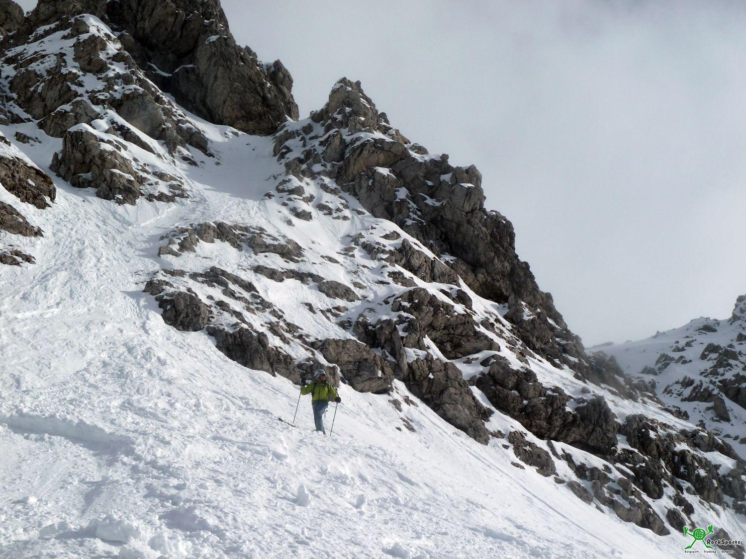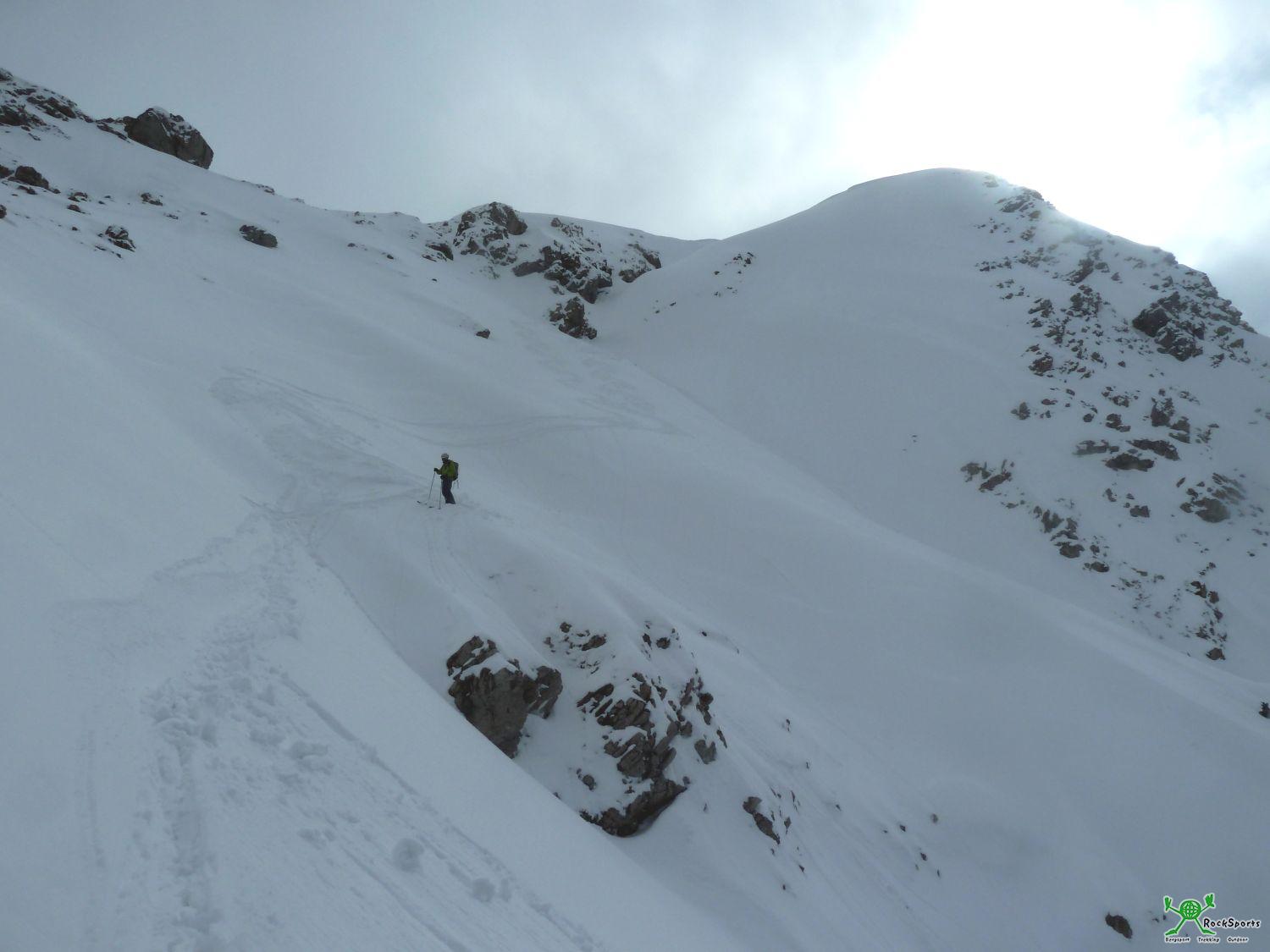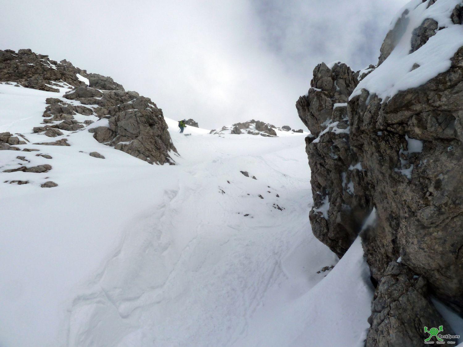 Von der Einfahrt in eine Rinne/Mulde langsam steiler werdend hinab. Nach dieser Mulde weitet sich das Gelände etwas und man befindet sich direkt unterhalb der Scharte zwischen Großem und Kleinem Daumen und man fährt der Engstelle entgegen.