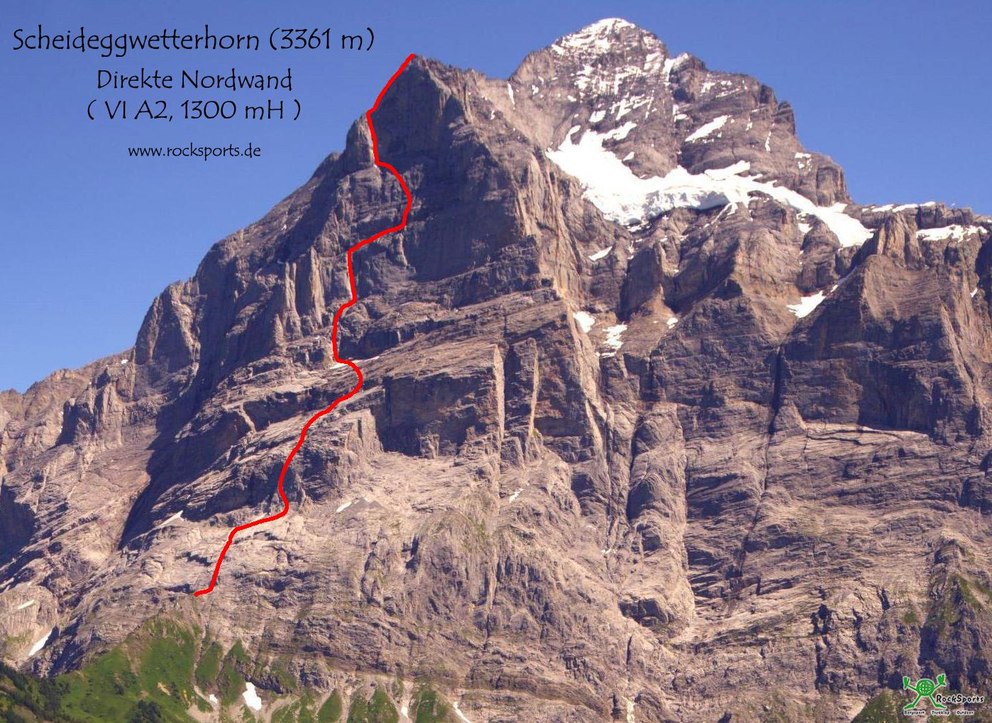 „Von Grindelwald oder der GrossenScheidegg aus betrachtet, hinterlässt das Scheideggwetterhorn mit seinen gewaltigen NO-NW Abstürzen einen unauslöschlichen Eindruck. Die gegen 1300 m hohe N-Wand gliedert sich deutlich in zwei Teile…“