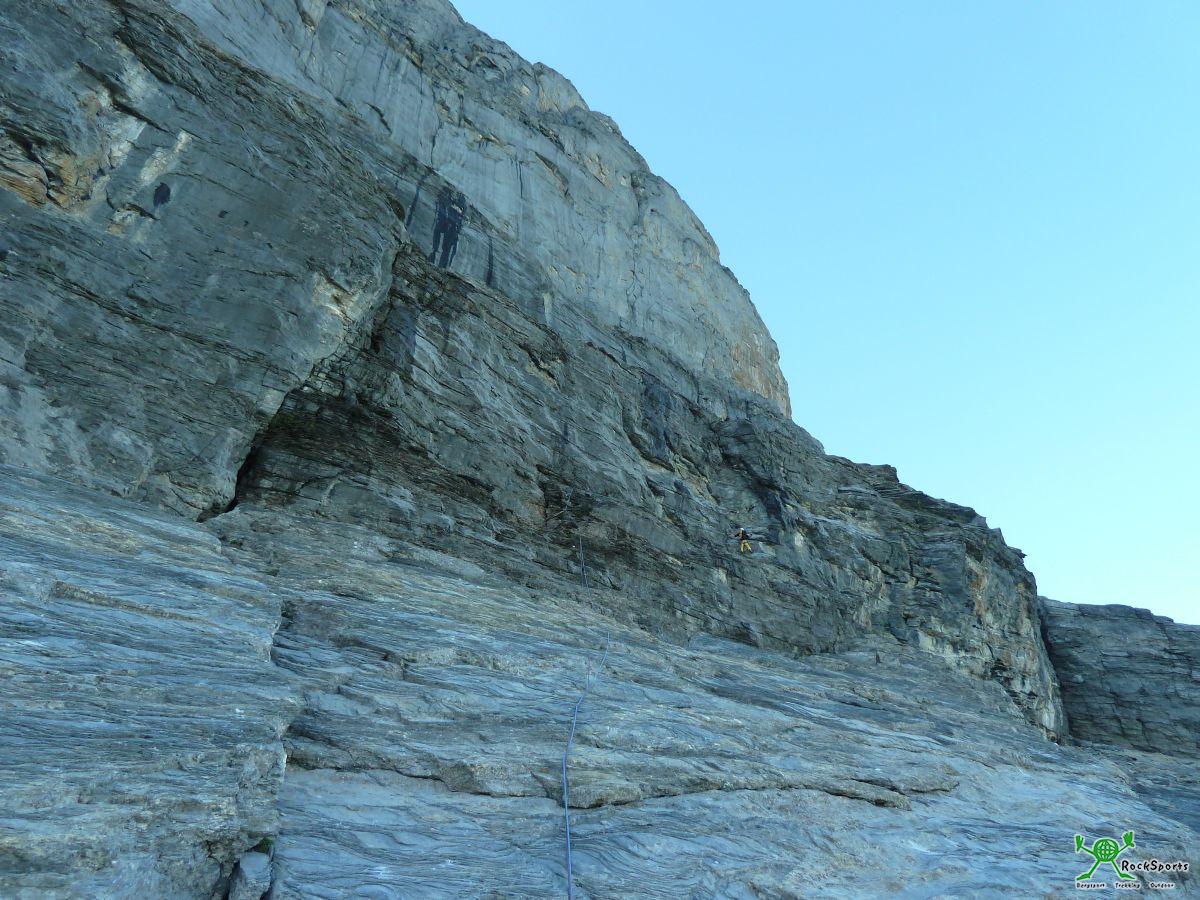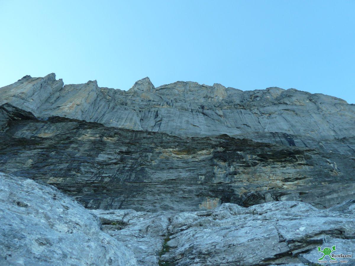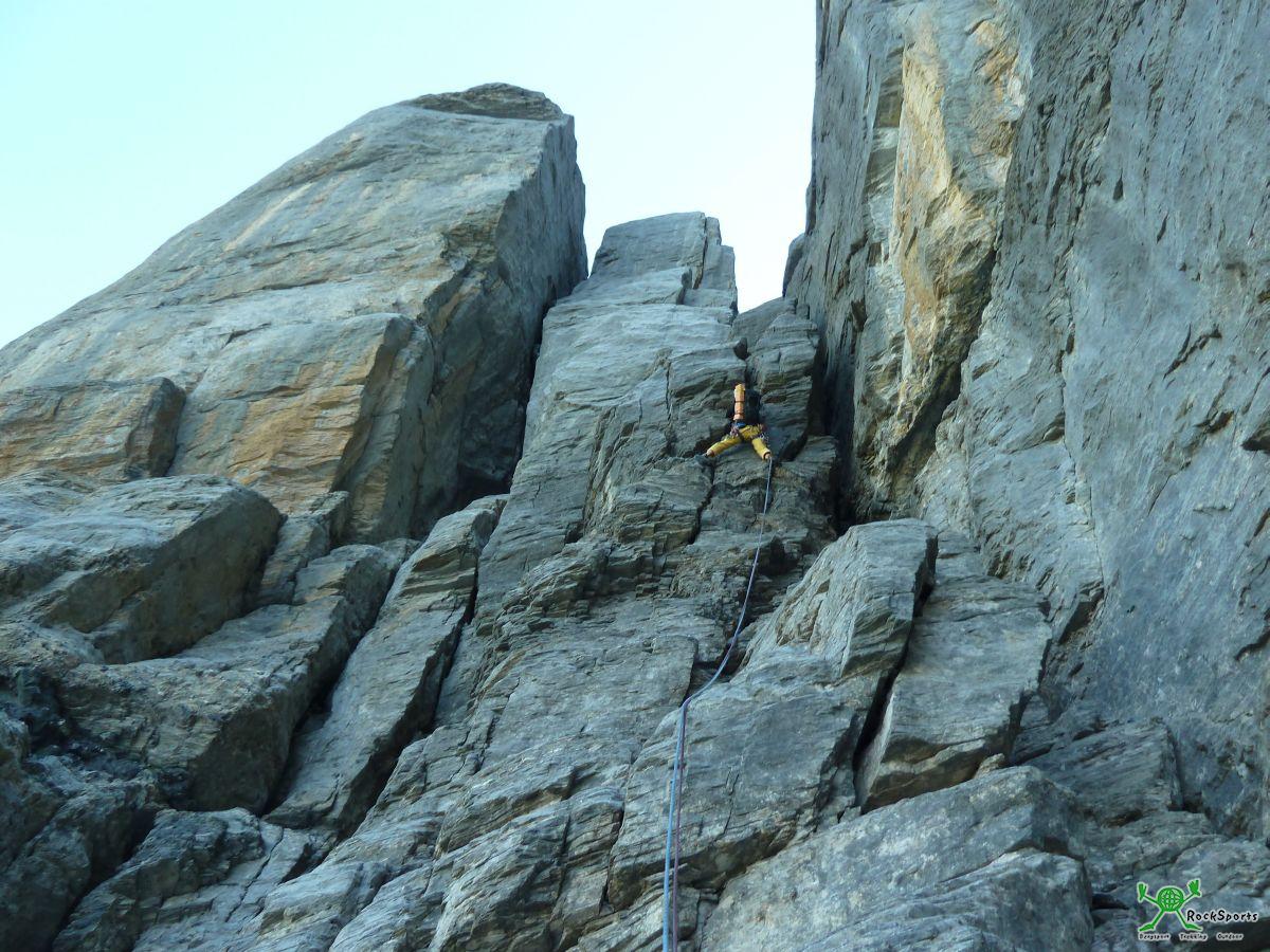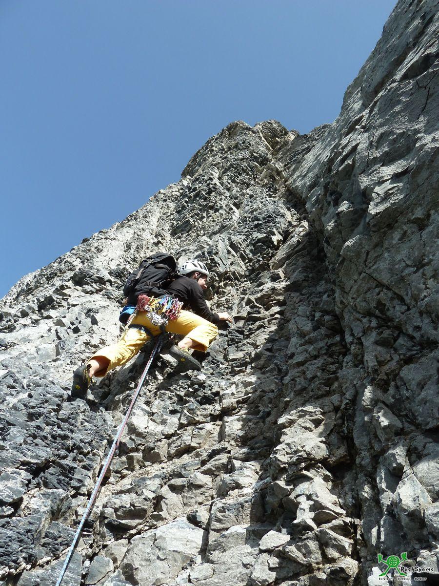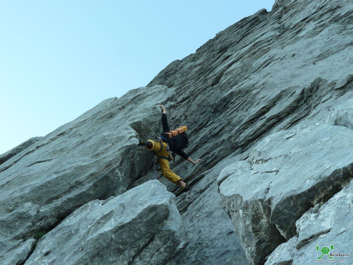 Vom Einstieg geht es zunächst durch eine markante Rinne mit diversen alten Fixseilen (III-IV) hinauf und nach rechts über teils schuttbedeckte Platten unter die zwei riesigen, an die Wand gelehnten Felspfeilern. Zunächst zum tiefsten Punkt zwischen den beiden Felspfeilern hinaufklettern (IV-V) und nach links durch einen Kamin auf den Kopf des linken Felspfeiler. Bis auf die letzte Seillänge vor dem Pfeilerkopf klettern wir alles seilfrei, was auch aus zeitlichen Gründen unbedingt zu empfehlen ist.