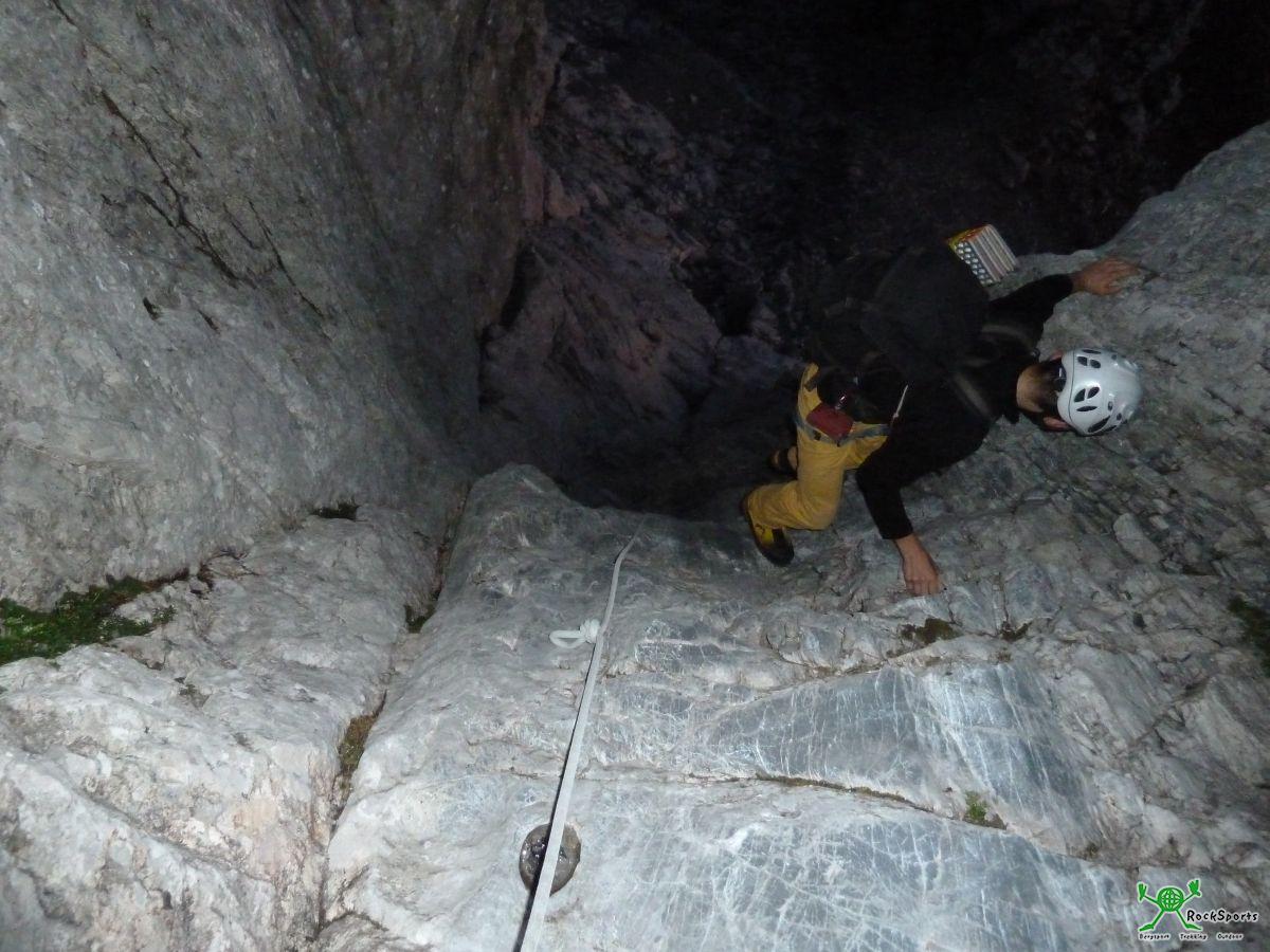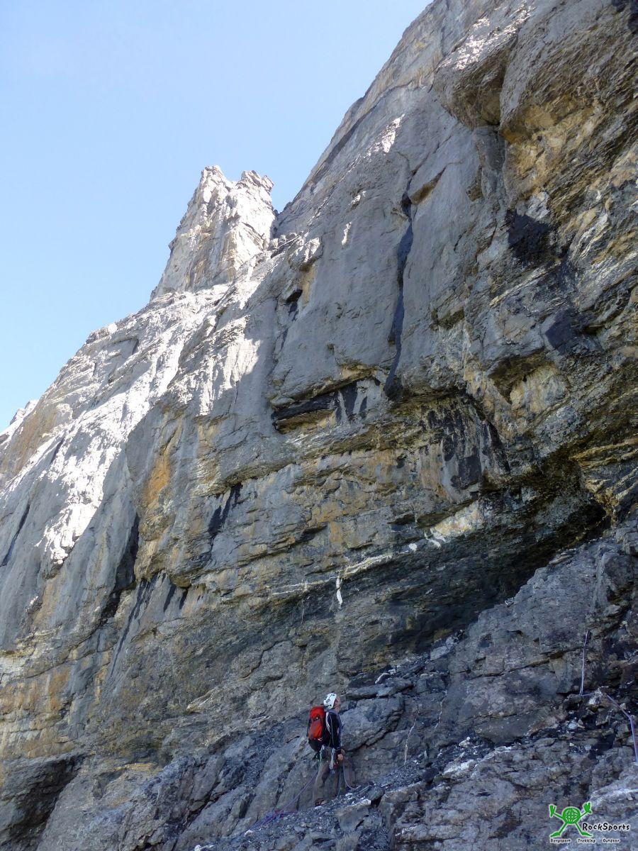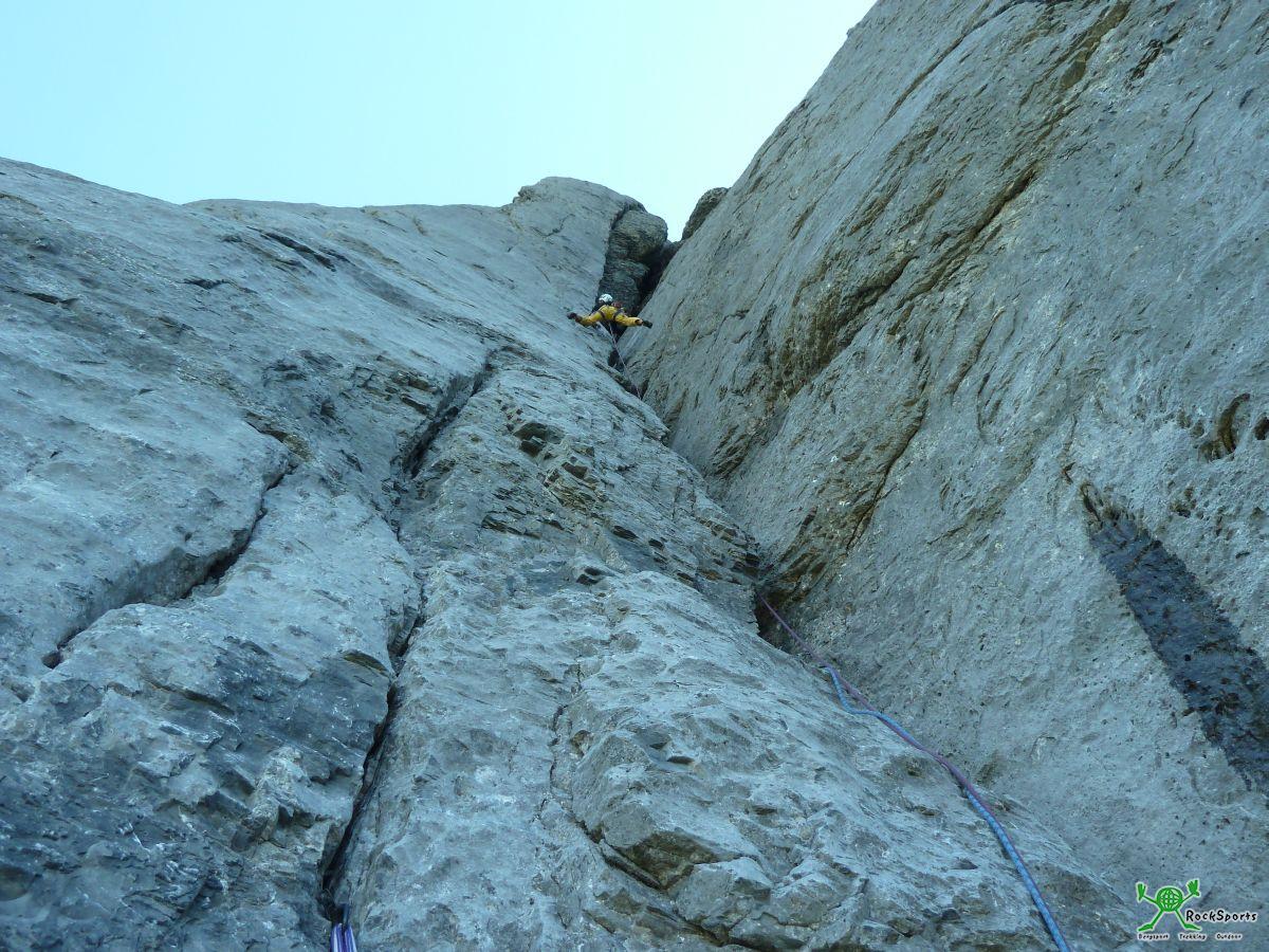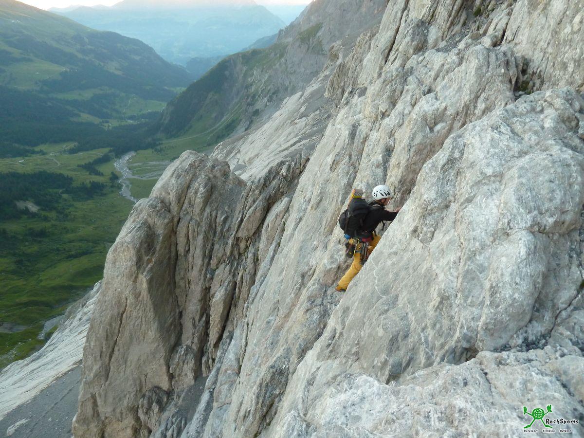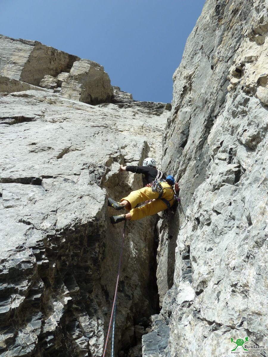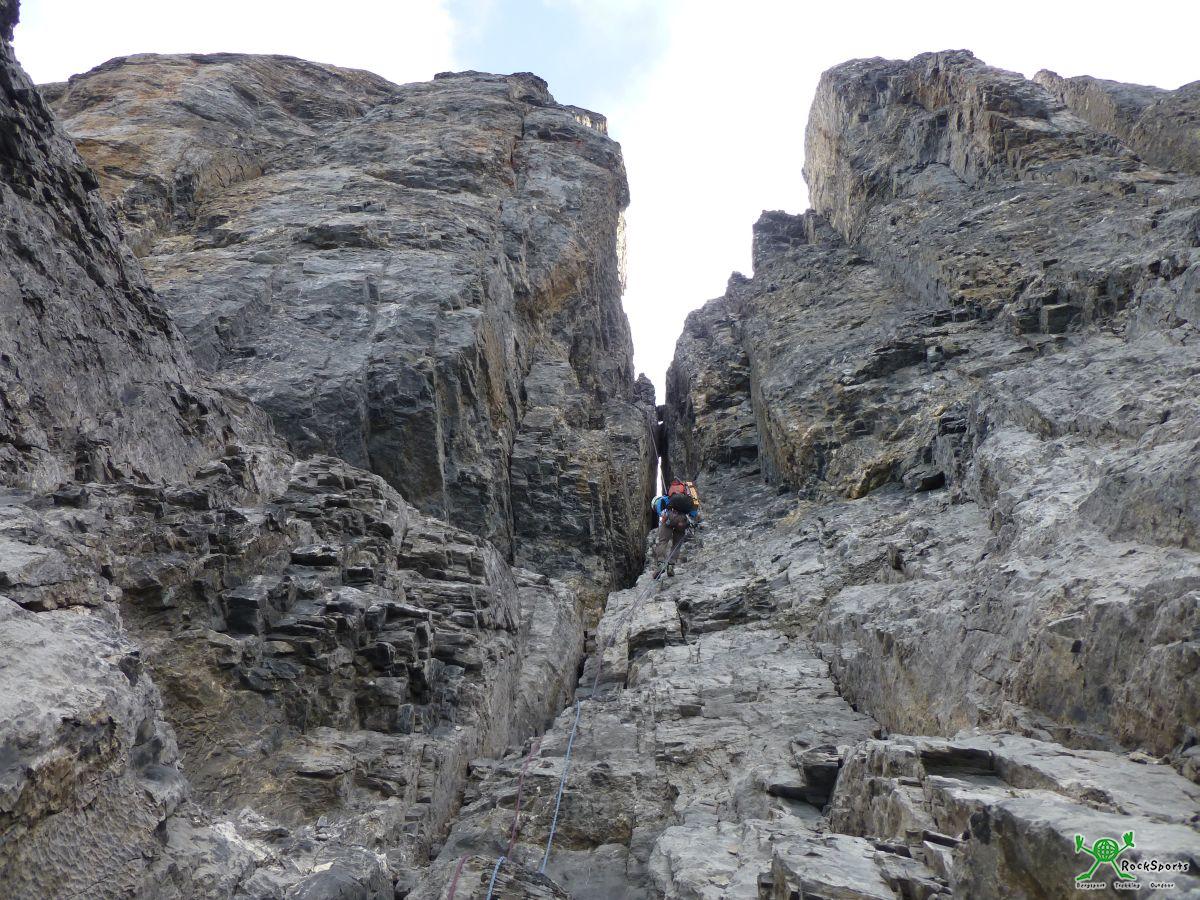 Vom Einstieg geht es zunächst durch eine markante Rinne mit diversen alten Fixseilen (III-IV) hinauf und nach rechts über teils schuttbedeckte Platten unter die zwei riesigen, an die Wand gelehnten Felspfeilern. Zunächst zum tiefsten Punkt zwischen den beiden Felspfeilern hinaufklettern (IV-V) und nach links durch einen Kamin auf den Kopf des linken Felspfeiler. Bis auf die letzte Seillänge vor dem Pfeilerkopf klettern wir alles seilfrei, was auch aus zeitlichen Gründen unbedingt zu empfehlen ist.