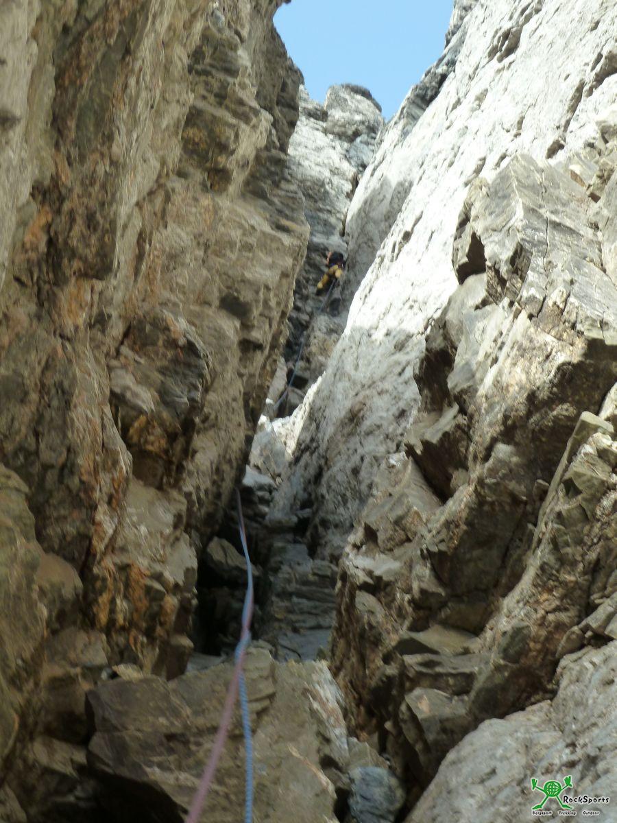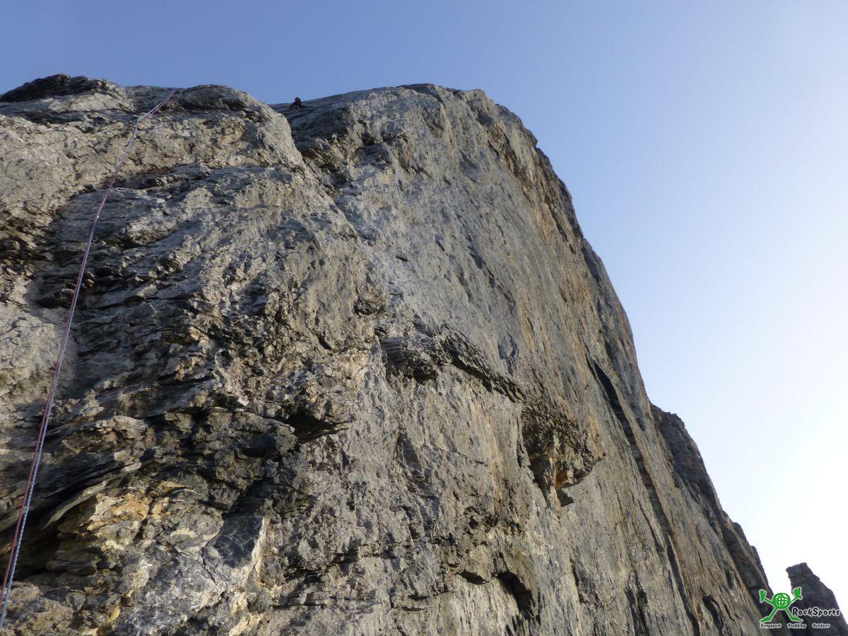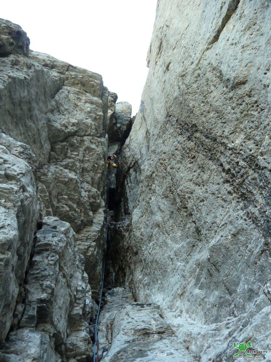 Wie sehr oft in dieser Wand ist nun sonnenklar das man über diese folgenden Kamine nach oben muss. Wo aber genau, im rechten, im linken oder eine Mischung aus beiden ist einem zunächst völlig unklar und es bedarf einer gehörigen Portion Gespür für den idealen Routenverlauf. Wir sind jedenfalls zunächst im rechten Bereich eine Seillänge hoch, bis zu Bohrhakenstand im tiefen Kamin. Direkt vom Stand aber an der linken Begrenzungswand ein paar Meter hoch und Quergang nach links in den linken Kamin. In diesem linken Kamin schwer und kurz heikel nach oben. Keine Ahnung ob das der beste Weg war, aber der rechte Kamin oberhalb des Standes sieht eher noch unangenehmer und wilder aus. Danach wird es für drei lange Seillängen wieder etwas leichter (IV-V). Bevor man das zentrale Kaminsystem am westlichsten der drei gelbroten Pfeilern erreicht.