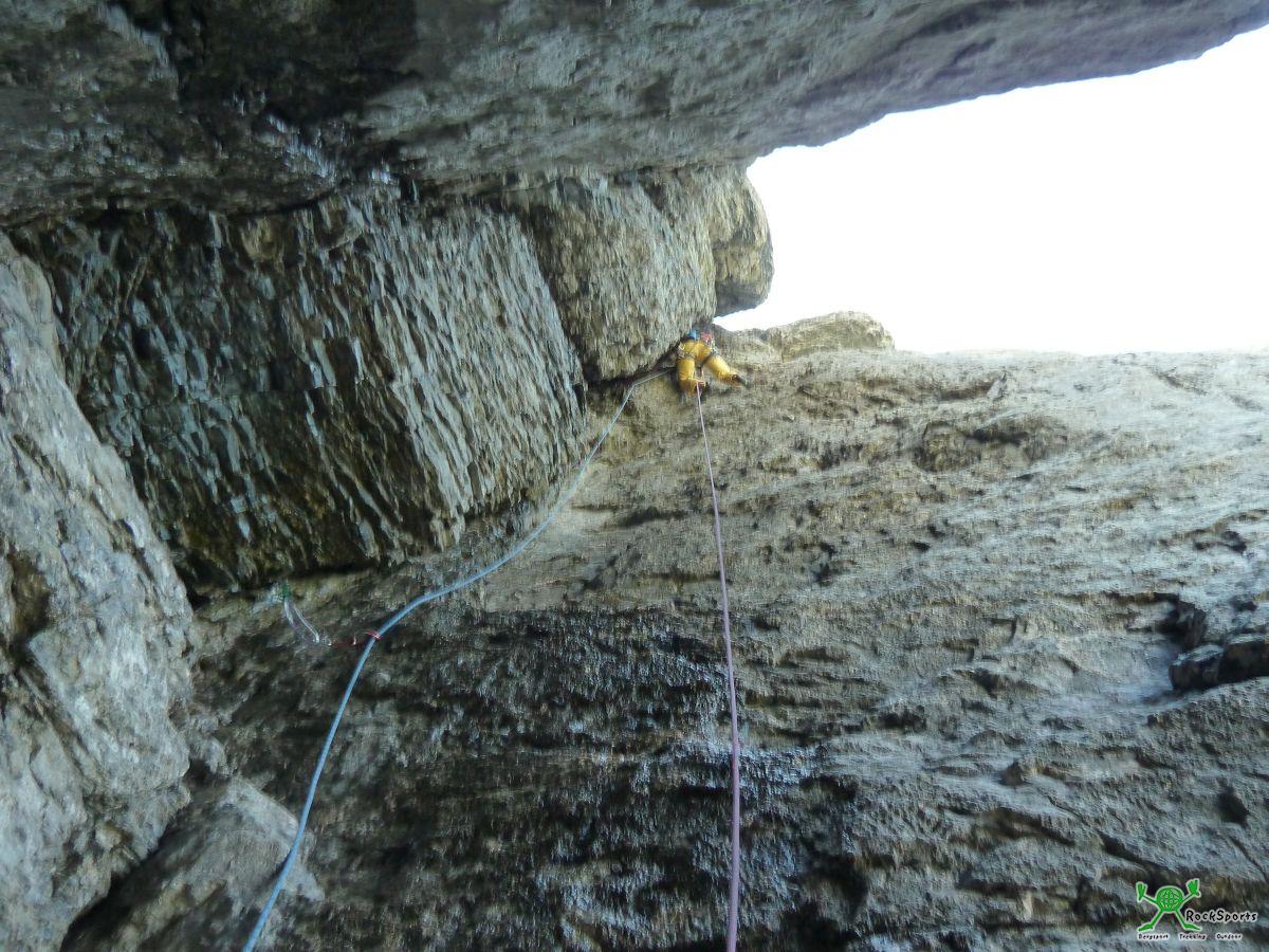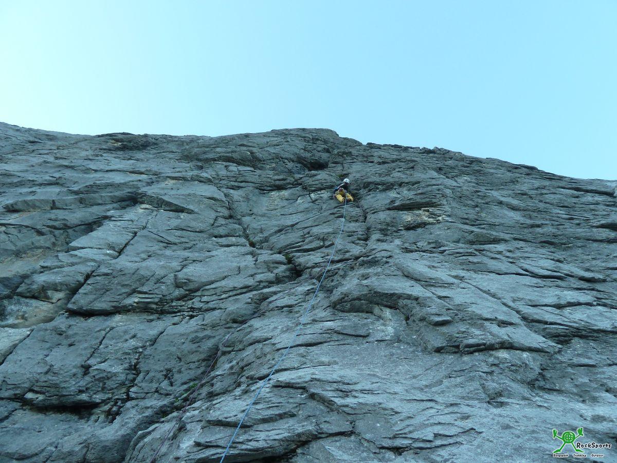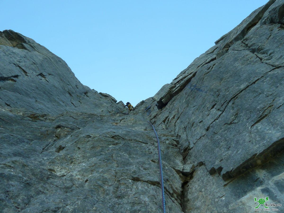Wie sehr oft in dieser Wand ist nun sonnenklar das man über diese folgenden Kamine nach oben muss. Wo aber genau, im rechten, im linken oder eine Mischung aus beiden ist einem zunächst völlig unklar und es bedarf einer gehörigen Portion Gespür für den idealen Routenverlauf. Wir sind jedenfalls zunächst im rechten Bereich eine Seillänge hoch, bis zu Bohrhakenstand im tiefen Kamin. Direkt vom Stand aber an der linken Begrenzungswand ein paar Meter hoch und Quergang nach links in den linken Kamin. In diesem linken Kamin schwer und kurz heikel nach oben. Keine Ahnung ob das der beste Weg war, aber der rechte Kamin oberhalb des Standes sieht eher noch unangenehmer und wilder aus. Danach wird es für drei lange Seillängen wieder etwas leichter (IV-V). Bevor man das zentrale Kaminsystem am westlichsten der drei gelbroten Pfeilern erreicht.