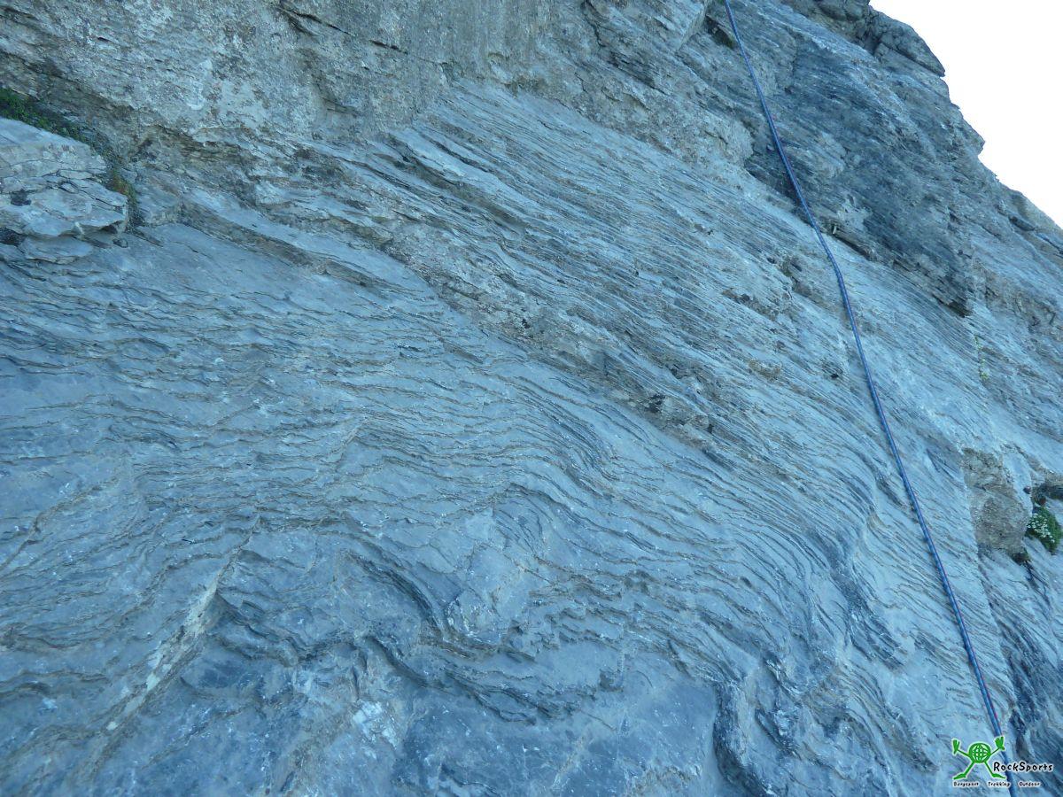 - Felsqualität: In den schweren Passagen (bis auf die eigentliche Schlüsselstelle) fester kompakter Fels. In der fast zwingend technisch zu kletternden Schlüsselstelle furchtbar brüchig (gut nur das man da eh den Fels nicht allzu viel berührt und nur hofft das die Haken halten).Auf den Terrassen teils unangenehme, geröllbedeckte und abwärtsgeschichtete Platten. Dazwischen immer wieder absicherungsfeindliches Bruch- und Scheißgelände diverser Kategorien insbesondere vor den Ausstiegskaminen.