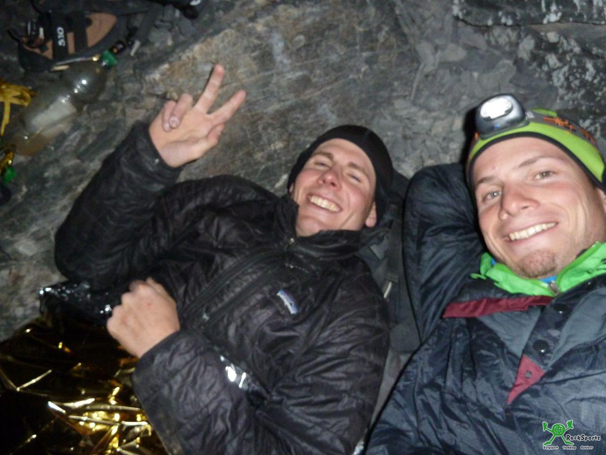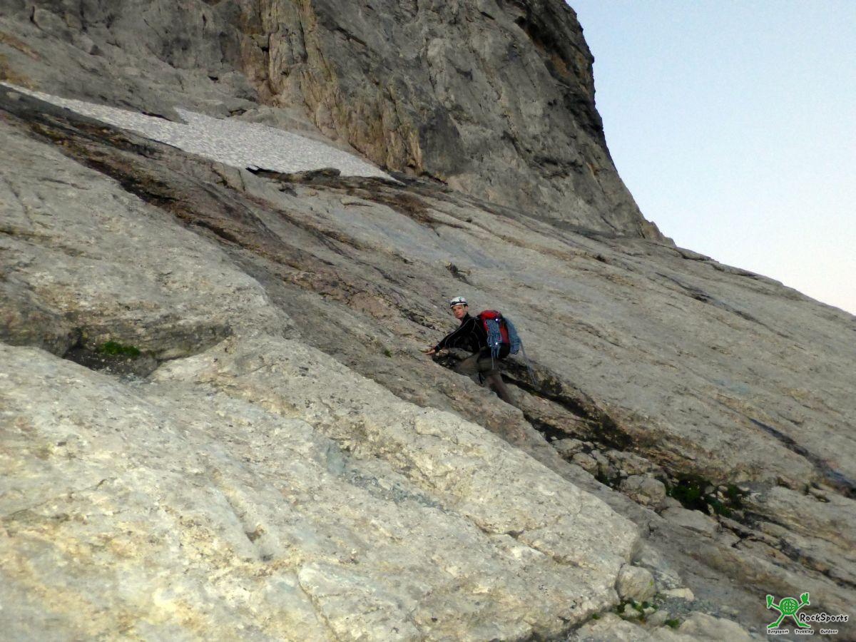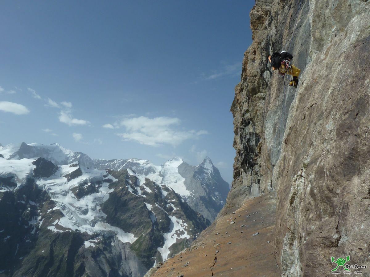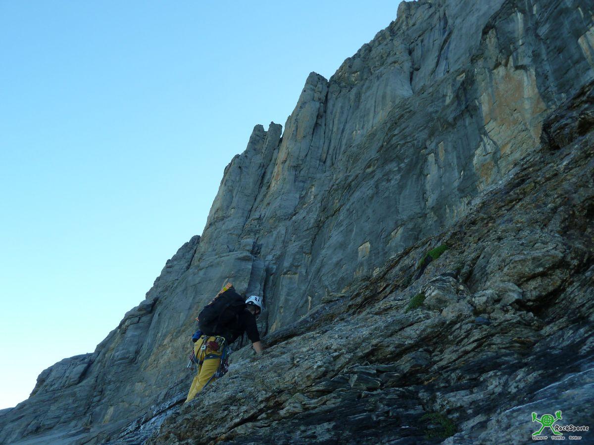 Gegen 14:45 Uhr steigen wir aus dem zentralen Kaminsystem aus. In den für uns ersten Sonnenstrahlen des Tages genießen wir unsere erste kurze Pause. Wir sind nun inzwischen schon über 9 h meist Vollgas am Klettern, da kommt eine kurze Pause mehr wie recht. Nach 5 Minuten geht es aber gleich weiter denn schließlich ist es noch ein langer, langer Weg bis zum Gipfel. Es folgt eine ca. 200m lange Querung auf breitem Band nach rechts. Die ca. 3-4 Seillängen liegen am langen Seil kletternd schnell hinter uns. Man kommt an einem sehr guten Biwakplatz vorbei. Dieser dürfte von Christoph Klein aus dem Jahr 2009 sein. (Eintrag auf bergtour.ch: gute Biwakstelle im Dreck gegraben).