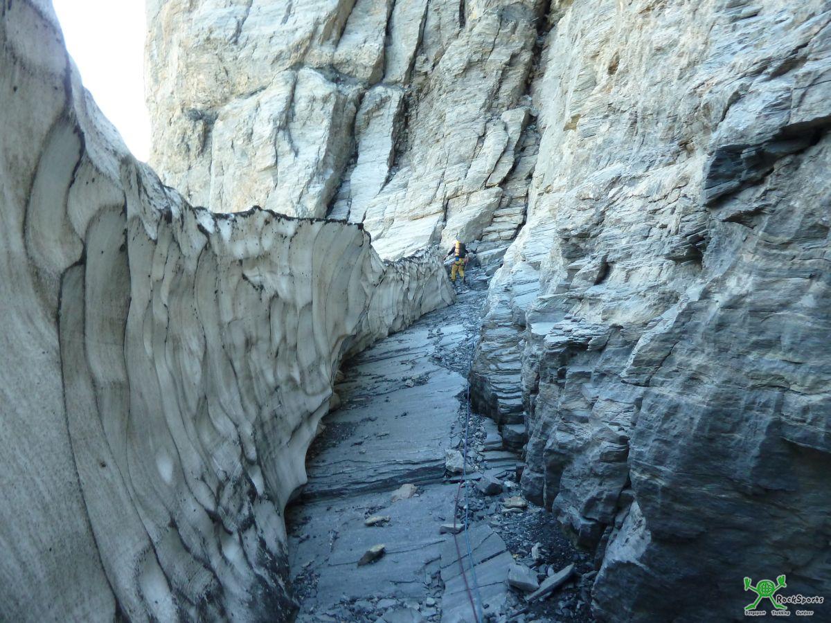 Im Nachhinein kann ich nur empfehlen, dem Grat bis in die im SAC-Führer beschriebenen Scharte zu folgen, auch wenn man müde ist und vom Bruch, dem ständigen Auf und Ab und dem ganzen Abenteuer-Alpinismus so langsam die Nase voll hat. Nach einem Wiederaufstieg zum nächsten Turm und insg. rund 70 m über den brüchigen Grat (ca. III) erreicht man eine gut eingerichte Abseilstelle über einer zweiten tiefe Scharte (ca. 15 m), danach geht`s nochmal hinauf und wieder eine gute, lange Seillänge bis zu Abseilstelle über einer dritten Scharte. Von hier kommt man mit Einfachseil bequem auf die Gutzseite des Kammes hinunter und kann den letzten Gratzacken unschwierig im flachen Gelände umgehen. Nun entweder über den Gratrücken weiter bis in die "SAC-Scharte" und durch das breite Couloir auf den Gletscher absteigen (ca. 40-45° / ev. Steinschlaggefahr). ODER: unmittelbar nach dieser Abseile über die ausgeprägte, durchgängige Schrofenrippe etwa 200 m zum nördlichen Gletscherrand hinunter (dieselbe Rippe, die Florian und Tobias weiter unten durch ihre Querung erreicht haben). Kurz oberhalb eines letzten, markanten "Rundkopfes" trifft man fast automatisch auf die Abseilstelle, von der man im Frühsommer mit 50 m-Doppelseil direkt den Gletscher erreichen kann. Später im Jahr reicht das sicher nicht mehr, in diesem Fall kann man jedoch kurz über dem letzten Steilabbruch noch eine weitere Abseilstelle nutzen. Insgesamt gewiss die sicherste und nervenschonendste Variante, die man selbst bei Nebel oder weichem Neuschnee in der Mittagshitze noch halbwegs kontrolliert hinunter kommt.