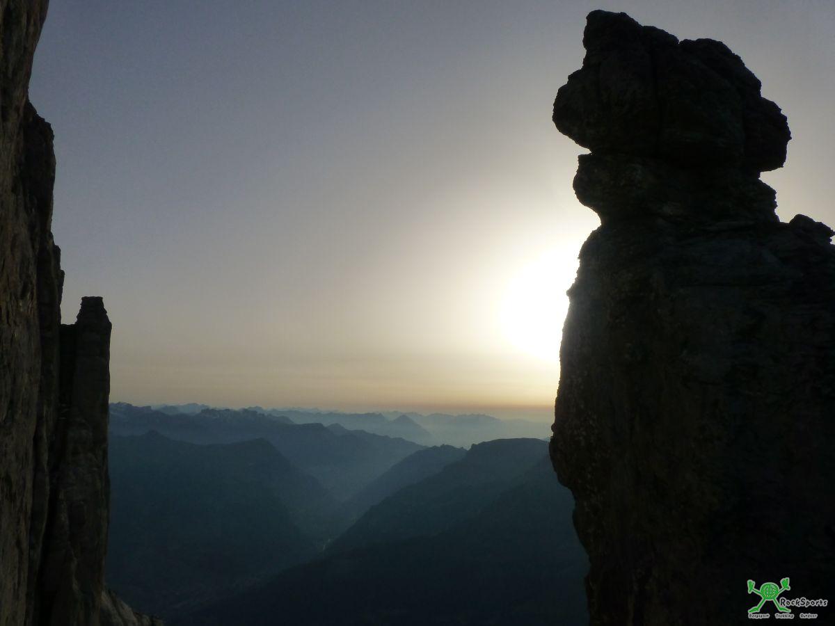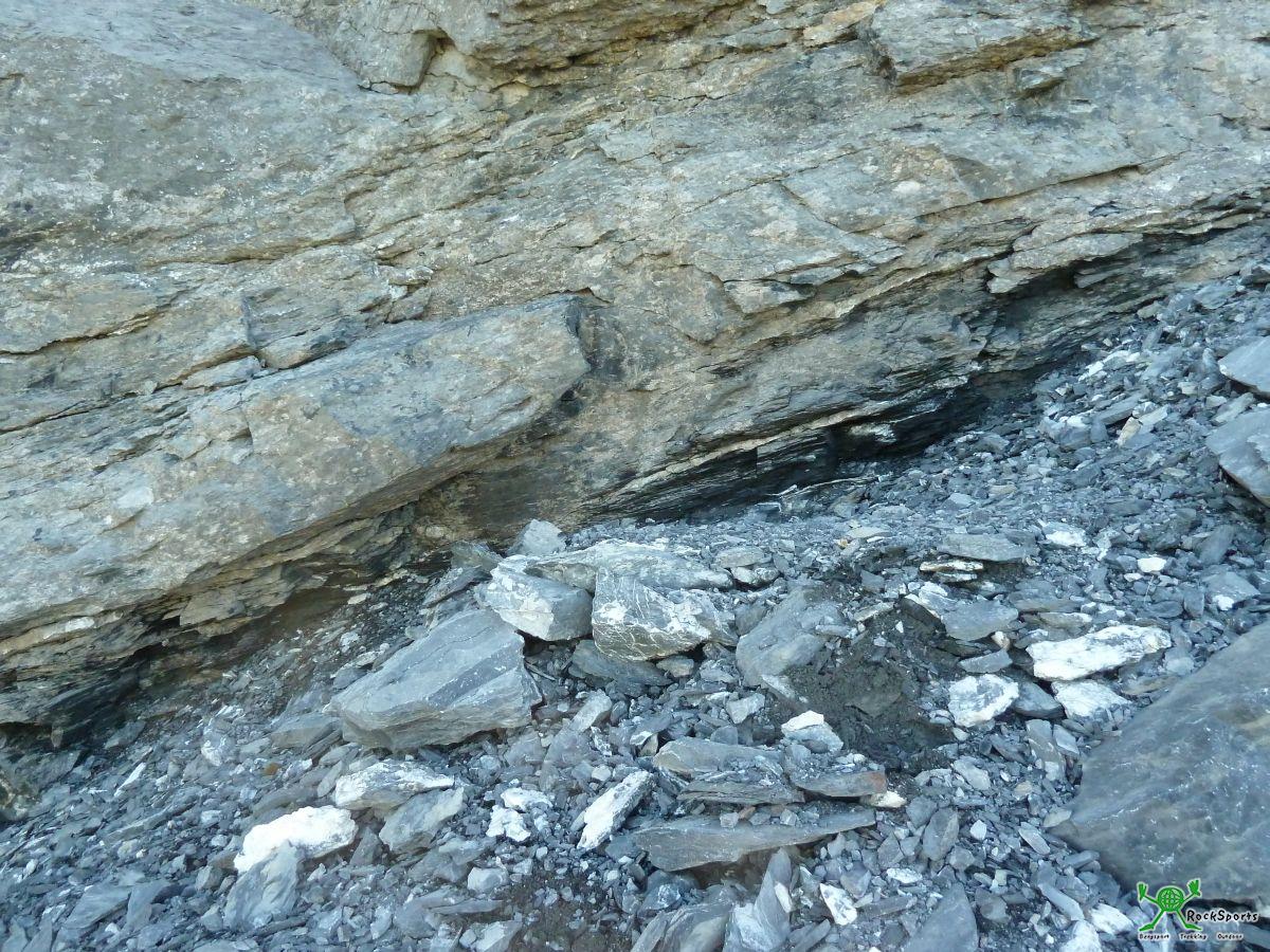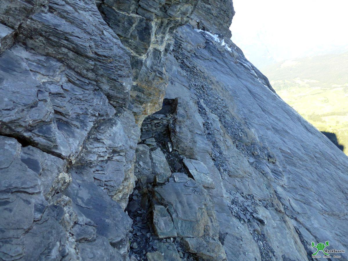 Wo genau die unangenehme und sicher brüchige Wandstufe zwischen 1. und 2. Terrasse richtigerweise zu überwinden ist haben wir nicht gefunden. Wir sind jedenfalls zu weit nach rechts geklettert und an einem Bohrhakenstand gelandet, relativ sicher von der Tour „Baston la baffe“. Unterhalb dieses Bohrhakenstandes und quasi am oberen rechten Ende der 1. Terrasse befindet sich ein ideal aussehender Biwakplatz (siehe Bild).