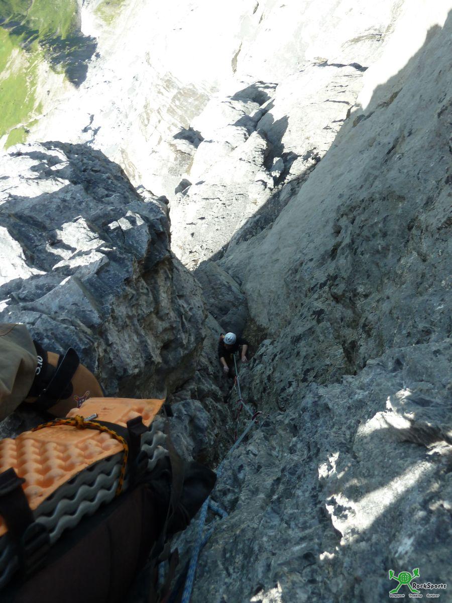 Persönlich freut es mich natürlich sehr, dass es gerade zum kleinen Jubiläum meiner 30. Pausetour „im extremen Fels“ und 10. in diesem Jahr ein solches Highlight wurde. Bis auf die furchtbar brüchige und fast zwingend technisch zu kletternde Schlüsselstelle konnte Florian alles OnSight klettern!!! Dank Florians enormen Kletterkönnen und Geschwindigkeit auch in heikelstem Gelände und durch vermutlich ideale Verhältnisse in der Wand, konnten wir die Tour sogar an einem Tag, also ohne meist übliches Wandbiwak, in knapp 15,5 h Kletterzeit durchsteigen und erreichten gegen 21:00 Uhr erschöpft aber überglücklich den Gipfel des Scheideggwetterhorn. Unsere Taktik schnell und leicht ging voll auf. Zwar mussten wir dies in Form eines kalten und spartanischen Gipfelbiwaks bezahlen, denn wir hatten weder Schlafsäcke, Essen noch Kocher dabei, aber einen Tod muss man für diese Wand sterben. Die Taktik beinhaltete außerdem das Florian die meisten heiklen Seillängen ohne Rucksack sicher und zügig durchsteigt und ihn nachzieht, bzw. ich mich mit dem sich ständig verhängenden nachgezogenen Rucksack von Florian und meinem auf dem Rücken durch die Kamine schinde. In wenigen Seillängen haben wir auch beide Rucksäcke hinterhergezogen.