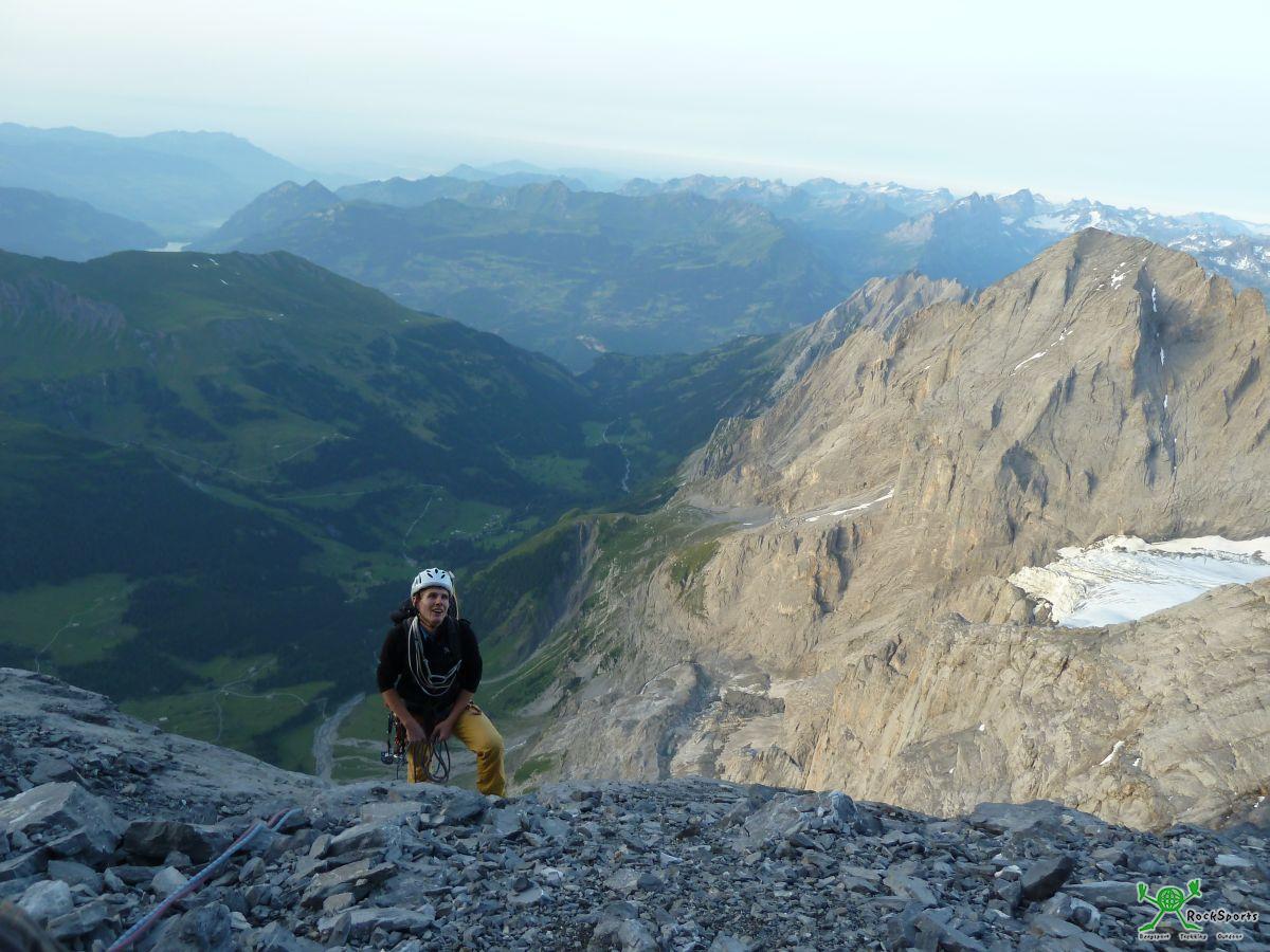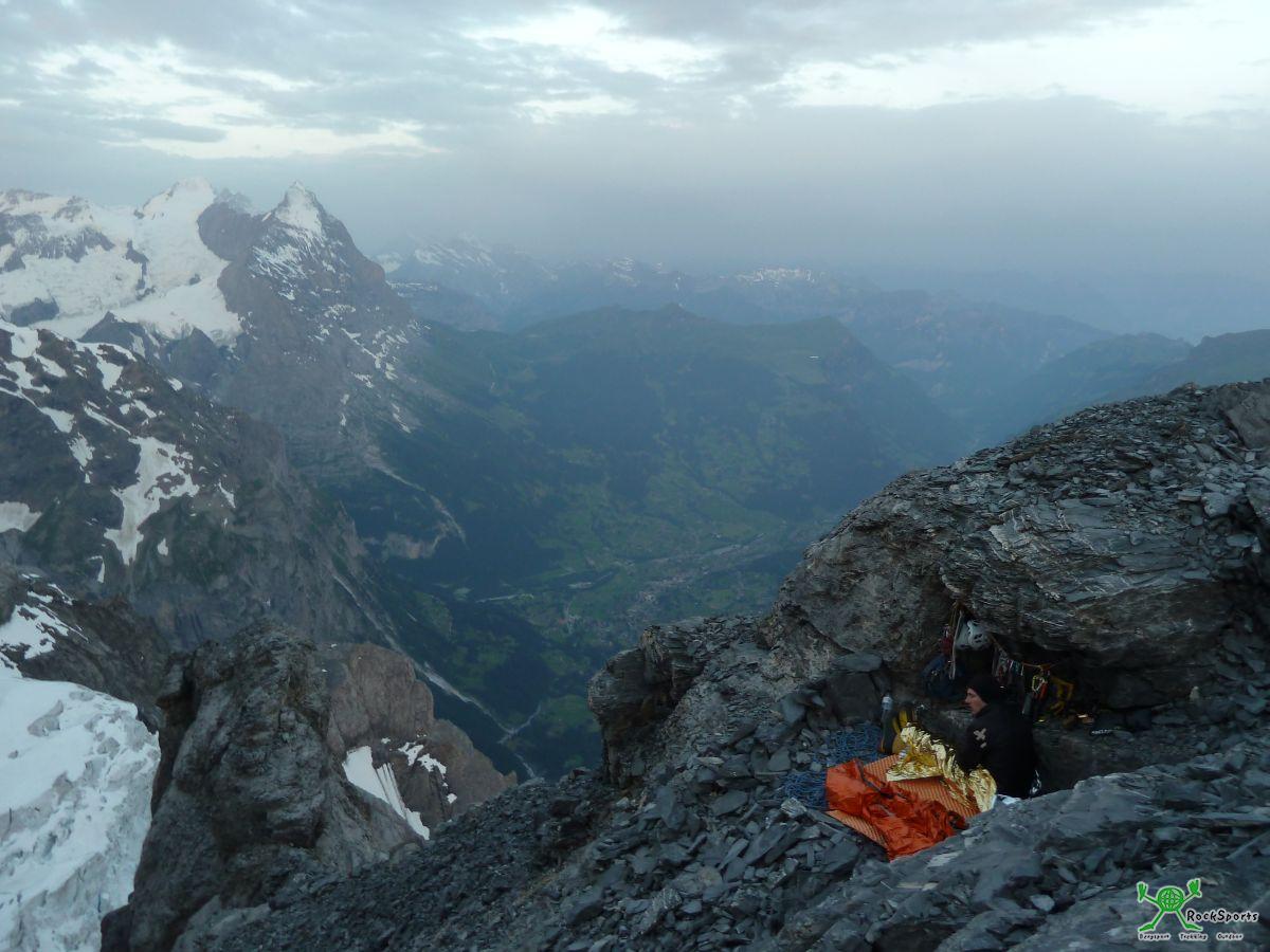 Zum Glück befindet sich ca. 10 m westseitig unterhalb des Gipfels ein super Biwakplatz für zwei Personen. Unser spartanisches Nachtlager ist bald „aufgebaut“ und besteht aus je 60 m Seil, je einem Rucksack, ein paar Falten einer Z-lite Isomatte und bei mir aus dem Bivi von Mountain Equipment und bei Florian sogar nur aus einer Rettungsdecke in die er sich einwickelt. Mit ein paar Riegeln und ein paar verbliebenen Schlücken zu Trinken ist auch das Abendessen bald erledigt und bei auffrischendem Wind versuchen wir einzuschlafen. Natürlich ist ein Biwak in fast 3400 mH mit nur Biwaksack oder Rettungsdecke eher kalt und mit Schlafen nicht allzu viel los. Man hat also genügend Zeit das am Tag erlebte zu verarbeiten. Gegen Ende der Nacht zieht auch noch eine kleine Störung durch und bringt ein paar Regentropfen. Trotz Wolken und etwas Regen genießen wir das Erwachen des Tages und die beeindruckenden Blicke auf Mönch, Eiger und andere große Berggipfel des Berner Oberland.
