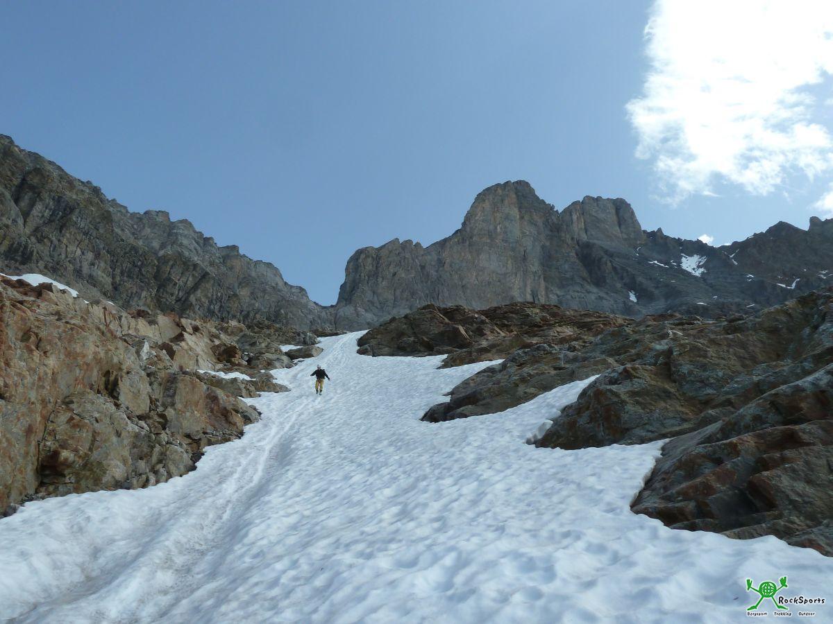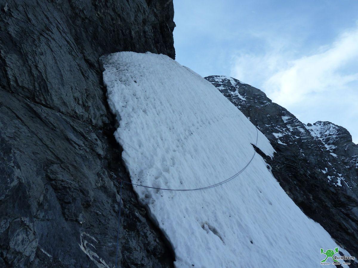 Nach diesem Wandriegel geht es über die 2. Terrasse nach links an den Fuß von einem markanten Doppelkamin am linken oberen Ende des vermutlich immer vorhandenen Schneefeldes. Wobei „gehen“ auch eher übertrieben ist. Über schuttbedeckte nasse Platten geht es nach links zum Schneefeld. Wir haben uns dann nicht getraut unterhalb des Schneefeldes rüber zu queren (noch glattere Platten und noch mehr Schutt) sondern sind am kürzesten Stück mit den Kletterschuhen übers Schneefeld geeiert und anschließend hinter dem Schneefeld zum Beginn des Kamins. Wer bis hierher das Gefühl hat alles ist gut gelaufen und man ist schnell, muss sich bewusst sein, das hier die steile Wand eigentlich erst so richtig losgeht, und alles andere zum Aufwärmen war. Gegen 10:15 Uhr stehen wir hinter dem Schneefeld auf der 2. Terrasse.