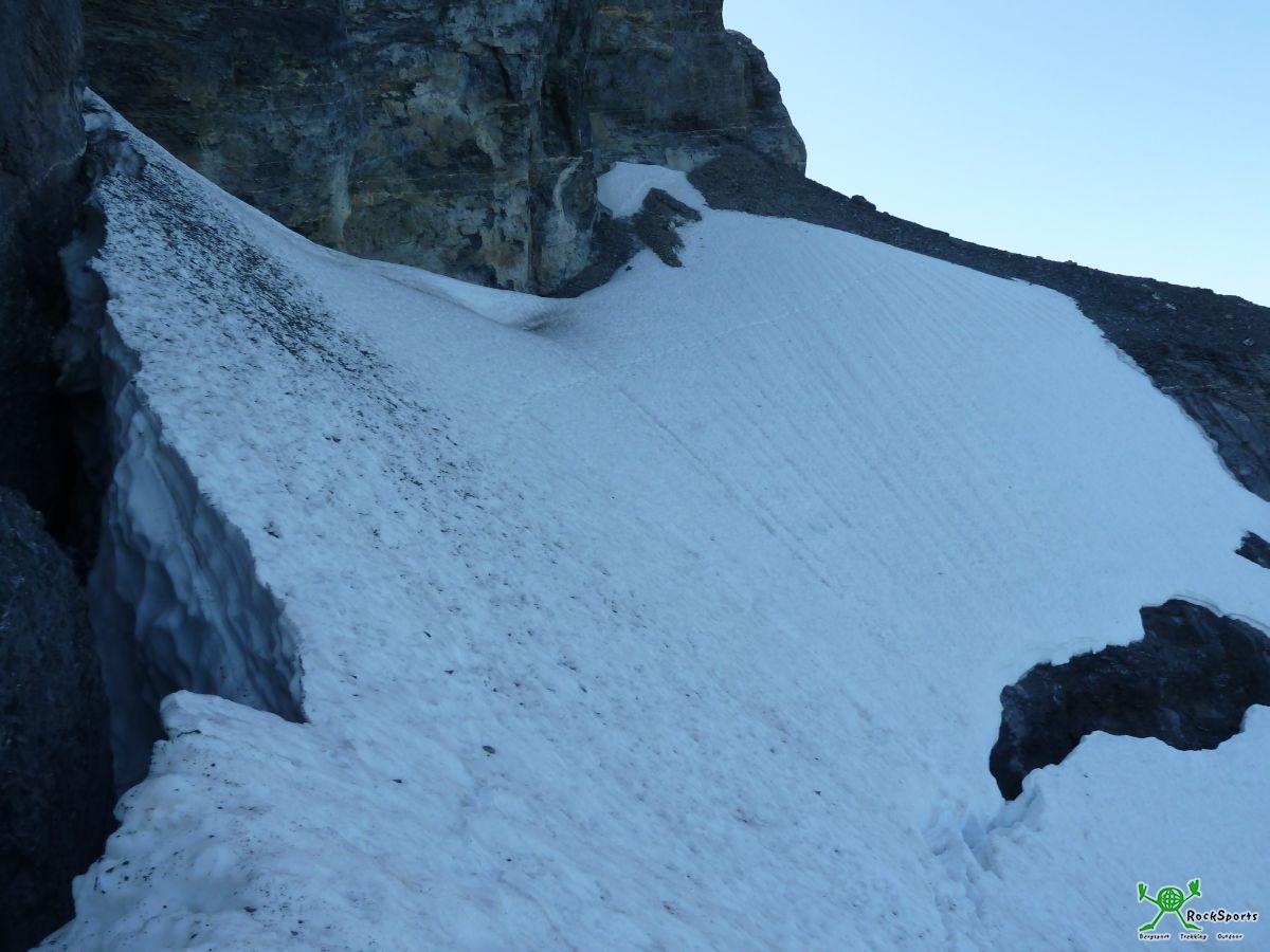 Über den Gutzgletscher ging es problemlos hinüber bis unter die Chrinne und wiederum problemlos konnten wir im Schnee bis zur Chrinne (3058 m)aufsteigen. Von dort aber zunächst noch ca. 100 m auf dem Grat nach rechts bis zu einem Block mit mehreren Schlingen und (nun wieder) aufgebautem Steinmann. Vom Block mit den Schlingen seilten wir ca. 55 m bis zu einer weiteren eingerichteten Abseilstelle (schwarzes Fixseil). Von dort in vollen 60 m + 5 m abklettern erreichten wir eine bequeme Terrasse welche den problemlosen Übergang auf den Chrinnengletscher ermöglichte.