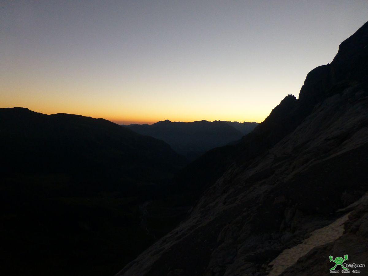 Gegen 04:45 Uhr starten wir und es geht immer mehr oder weniger direkt über den Grasrücken in 45 min zum Einstieg unter die Wand.