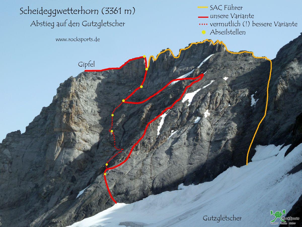 Der Abstieg vom Scheideggwetterhorn zur Glecksteinhütte ist dann auch nochmal ein Kapitel für sich und rundet das Gesamterlebnis der Unternehmung entsprechend ab. Die verschiedenen Beschreibungen im SAC-Führer, im Eintrag von Christoph Klein auf bergtour.ch von 2009 und im Info Teil auf extrem-collect.de von Nihat Knispel weichen schon etwas voneinander ab und so sind wir nicht so ganz schlüssig wie, was und wohin. Zunächst vom Gipfel immer direkt am Grat entlang bis in die erste markante Scharte welche man durch 10 m Abseilen erreicht. Von hier sieht der Weiterweg am Grat (SAC-Führer) entlang zwar gut möglich aber aufwendig aus. Das dicke Schlingenbüschel macht den Eindruck wie wenn doch die meisten gleich hier in die tiefe Schlucht abseilen. Also auch wir. Nach 60 m Abseilen sind wir hin und her gerissen den Spuren im Schneefeld (Seilschaft vom Westpfeiler zwei Tage vorher) nach links (orografisch) zu folgen oder in absolut ungut aussehendes und völlig unbekanntes Gelände von einer schon vorhandenen Abseilstelle abzuseilen. Wir entscheiden uns für die Spuren nach links. Nach einer heiklen langen Querung über steilen Schnee und brüchigen Fels erreichen wir eine Art Geländerücken. Über ihn steigen wir teils unangenehm ab bis wir weiter unten wieder auf eine Abseilstelle finden und von dieser 60 m (besser 2x 30m) bis auf den Gutzgletscher abseilen. Um etwas Licht ins Dunkle zu bringen habe ich von diesem ganzen Teil mal ein Übersichtsbild gezeichnet. Die punktierte Linie dürfte ungefähr die vermeintlich eingerichtete Abseilvariante sein (siehe Infos von Nihat Knispel auf extrem-collect). Allerdings ohne Gewähr, denn wir sind da ja nicht runter!