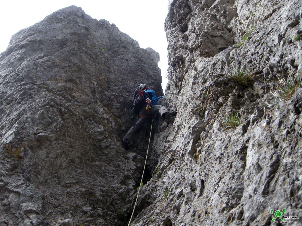 In der 3. Seillänge klettert man wieder in eine schmale Scharte des Hauptgrates hoch und kann an Bäumen Stand beziehen.