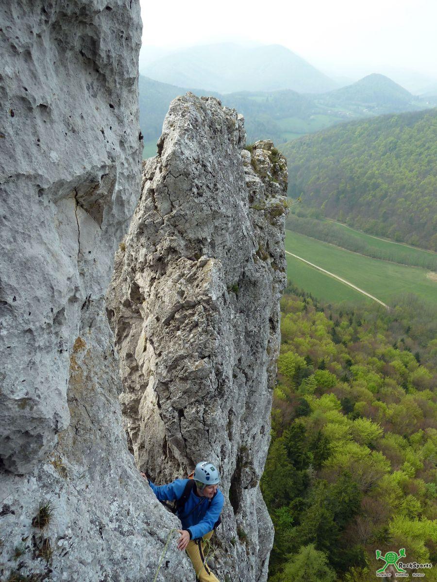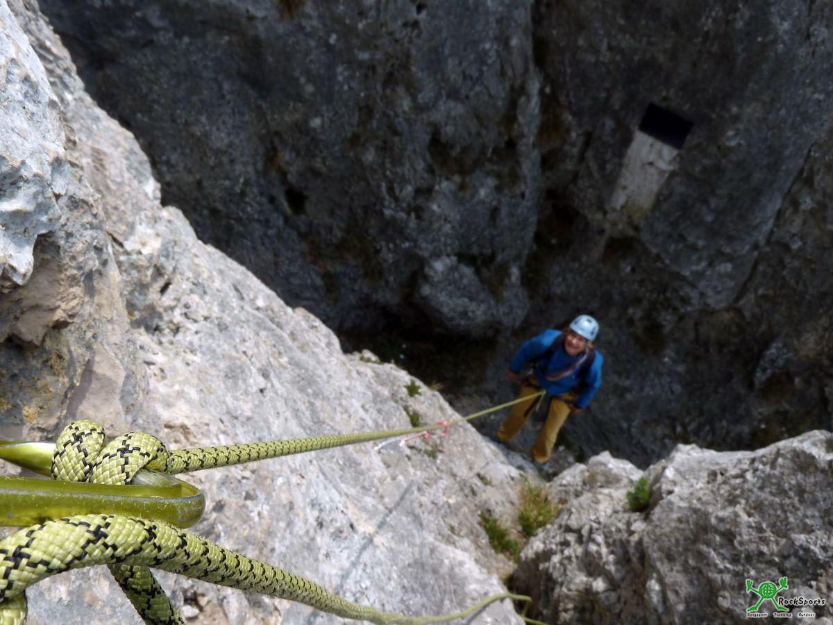 Auf dem leichten Originalweg folgt nach dem Stand ein kurzer Abseiler (ca. 8 m) bevor es auf der anderen Seite wieder empor geht. Entweder seilen beide ab oder einer wir abgelassen und klettert drüben wieder hoch zum Stand nach der 2. SL und der andere klettert das Abseilstück ab.