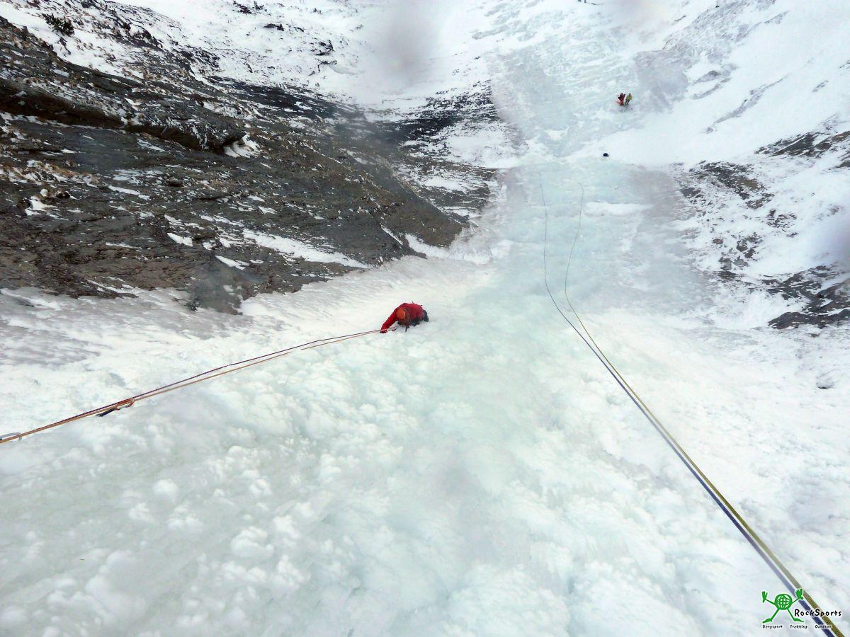Der untere flache Teil (ca. 130m) dürfte nur auf einigen Metern die 75-80° Marke streifen (WI 2-3). Wie schon erwähnt kletterten wir hier zunächst seilfrei, gefolgt von einer 90m Länge am langen Seil.