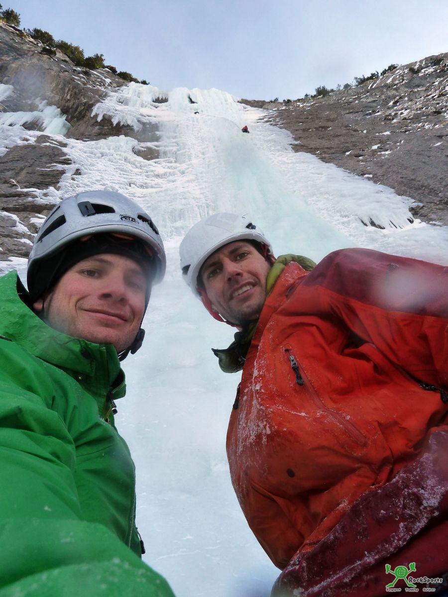 Nun waren es zwar „nur“ noch 25-30 m bis zum Ende der Hauptschwierigkeiten, doch diese Meter waren steiler und vom Eis her etwas anspruchsvoller als das zuvor gekletterte. Vom Ende der Hauptschwierigkeiten sind es nun nochmals 30m WI 2 Gelände bis man am Ende der Tour ist und „Il Mostro“, wie der Thron auf Italienisch bezeichnet wird, liegt hinter einem.