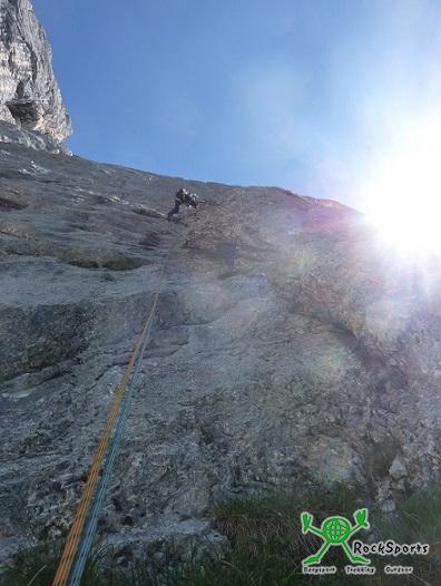 Alpinklassiker, über den man nicht viel Worte verlieren muss. Standhaken alle doppelt und gebohrt - auch in den leichten SL nach oben. Der Quergang ist durchgehen gebohrt und A0 ohne große Probleme zu bewältigen. Teile des Quergangs lassen sich auch fuer einen 6er Kletterer ganz gut frei klettern. Unten etwas schottrig. Im "Woll-Woll" Kamin hatte ich fast mein gesamtes Pulver verschossen, da ich den Rucksack nicht abnehmen wollte („ich doch nicht!“). Der Kamin ist auch gebort, klettern muss man trotzdem. Zwischenhaken sind teilweise erneuert und gebohrt. Die Abstände sind nicht plasier. Es steckt noch etwas altes Material, was einem eine Vorstellung der Verhältinisse in der Vergangenheit gibt. Da die Sonne schräg in die Wand kommt sind leider nur zwei Bilder sehenswert geworden.
