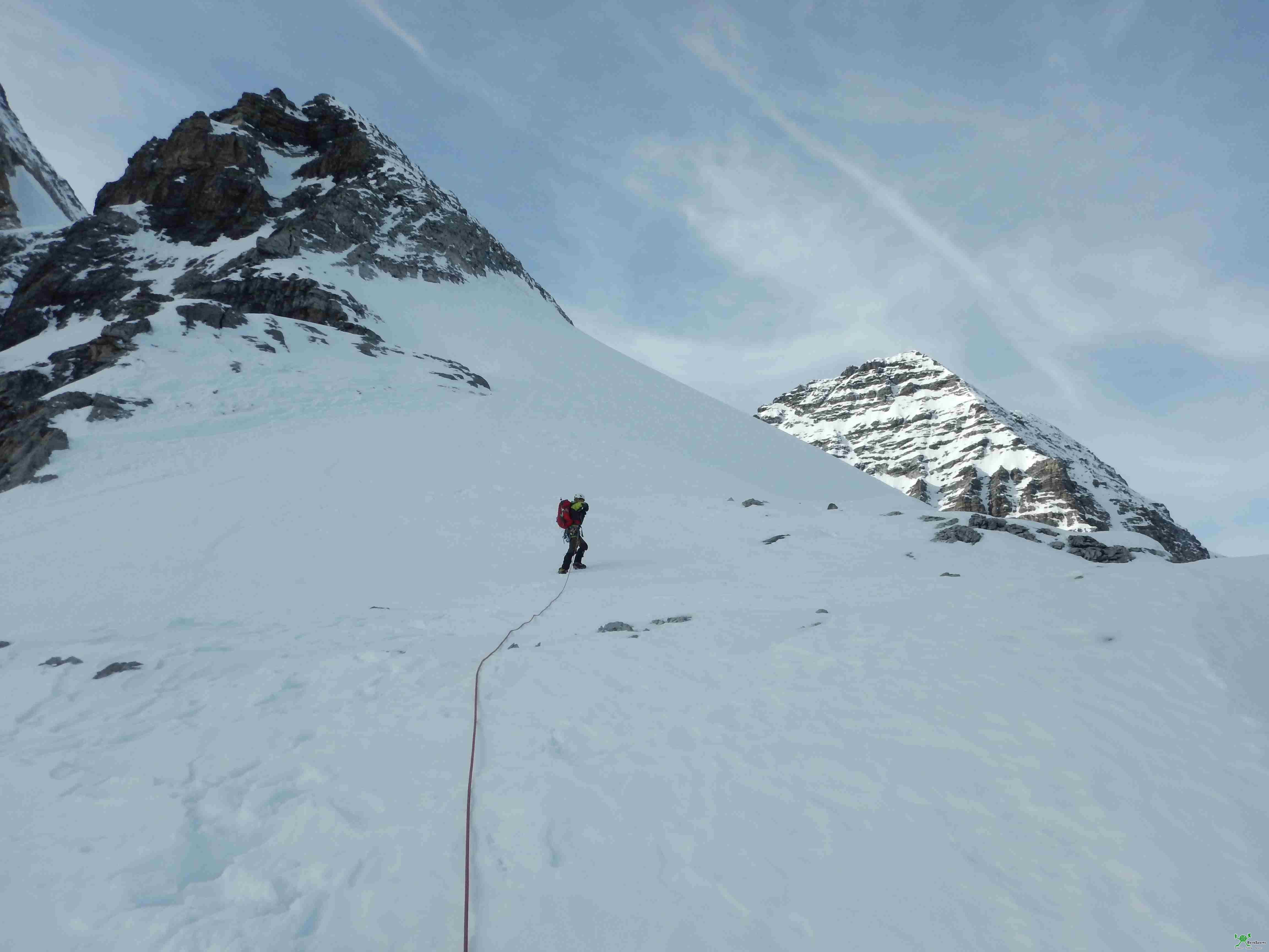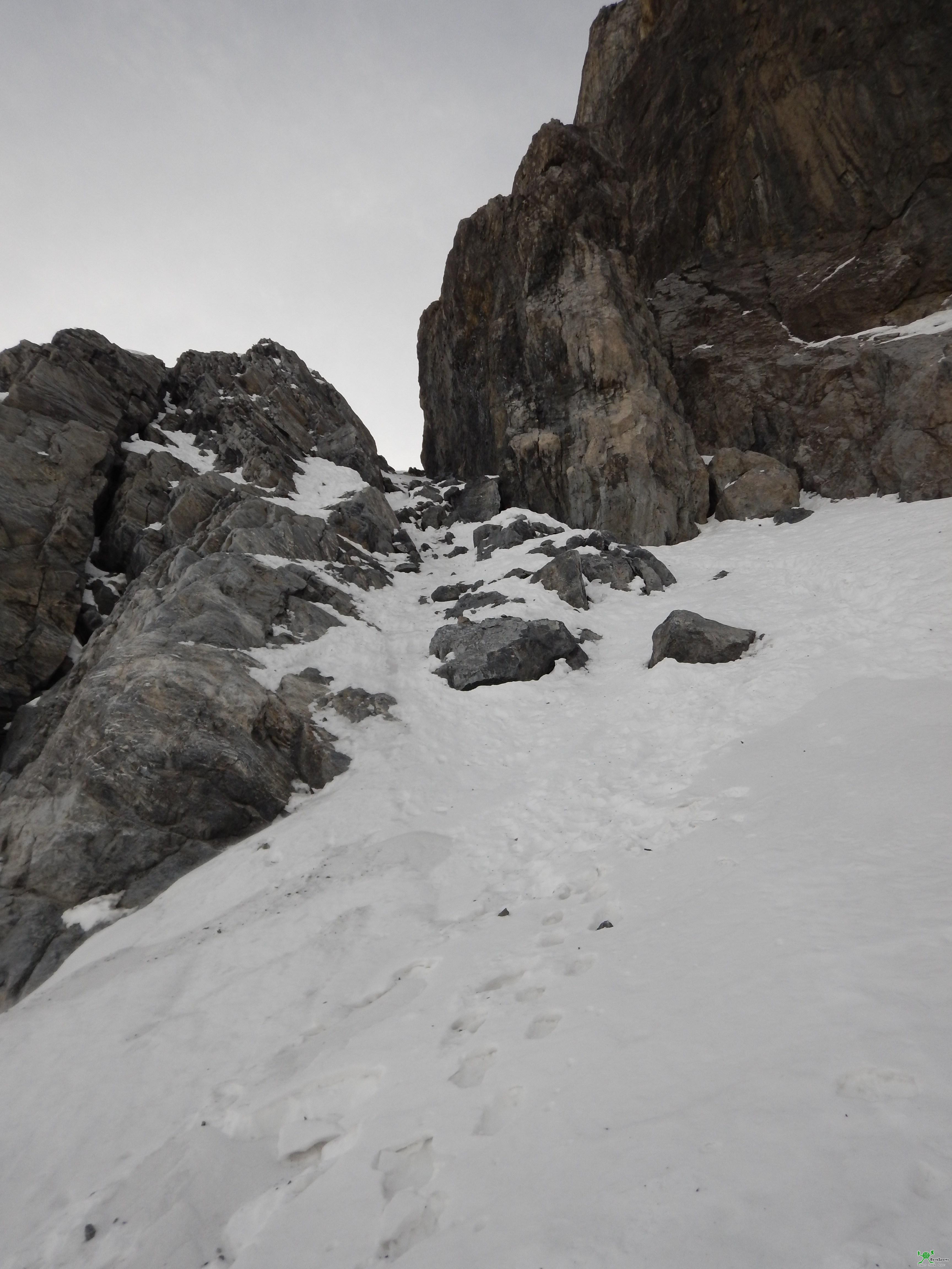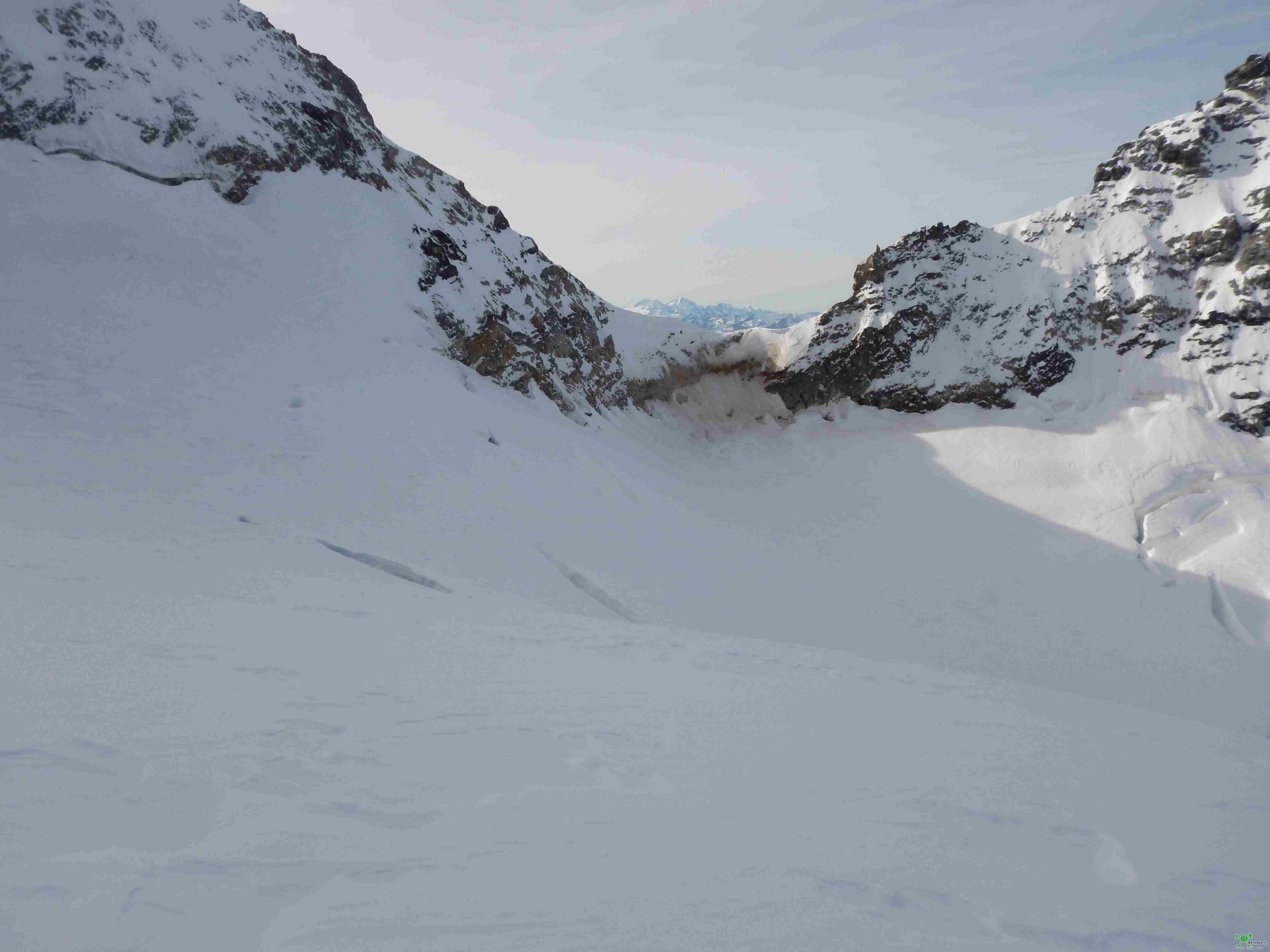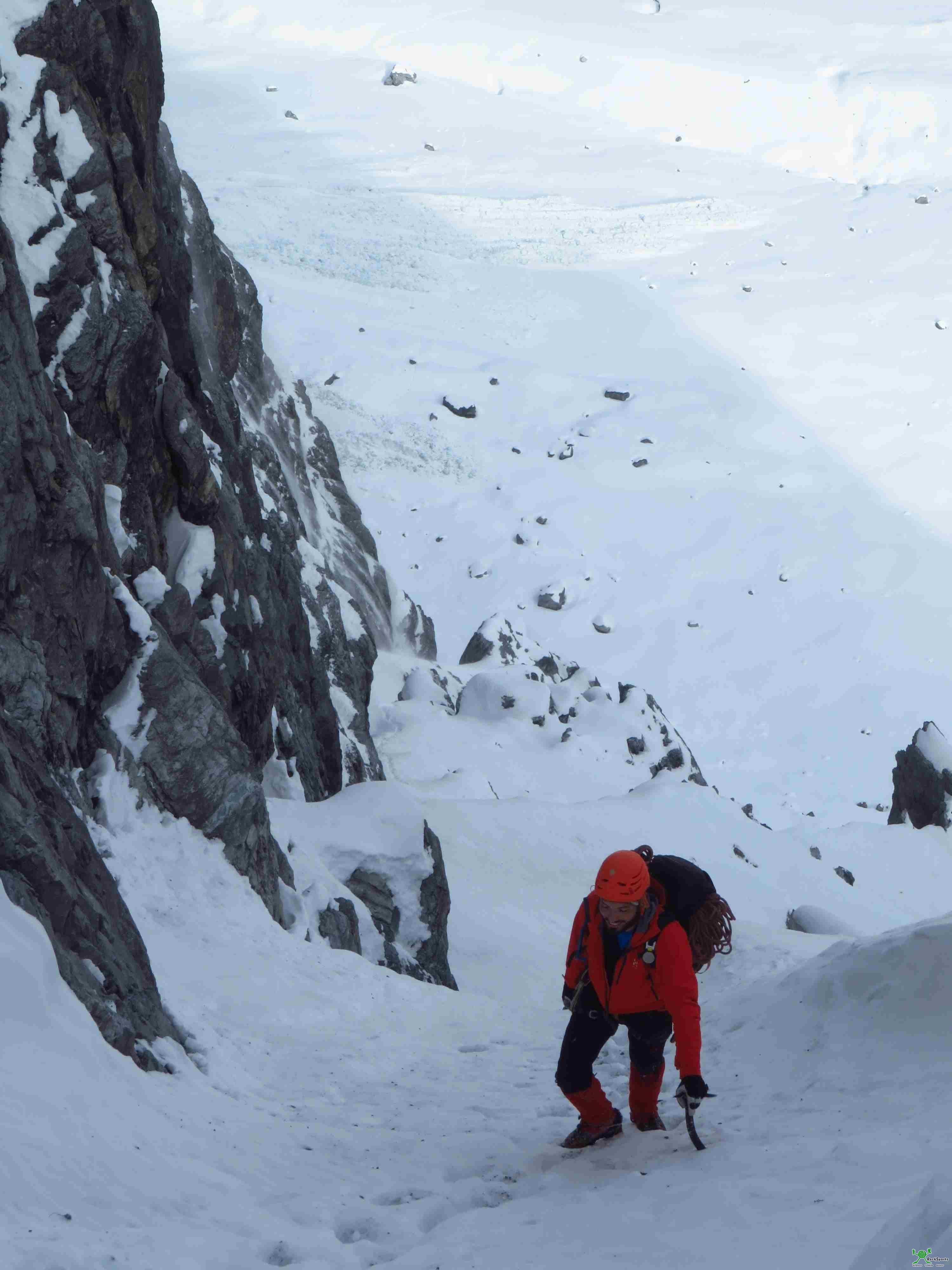Der Einstieg auf etwa 2700m erfolgt über eine deutliche von rechts unten nach links oben ziehende Firnrampe.