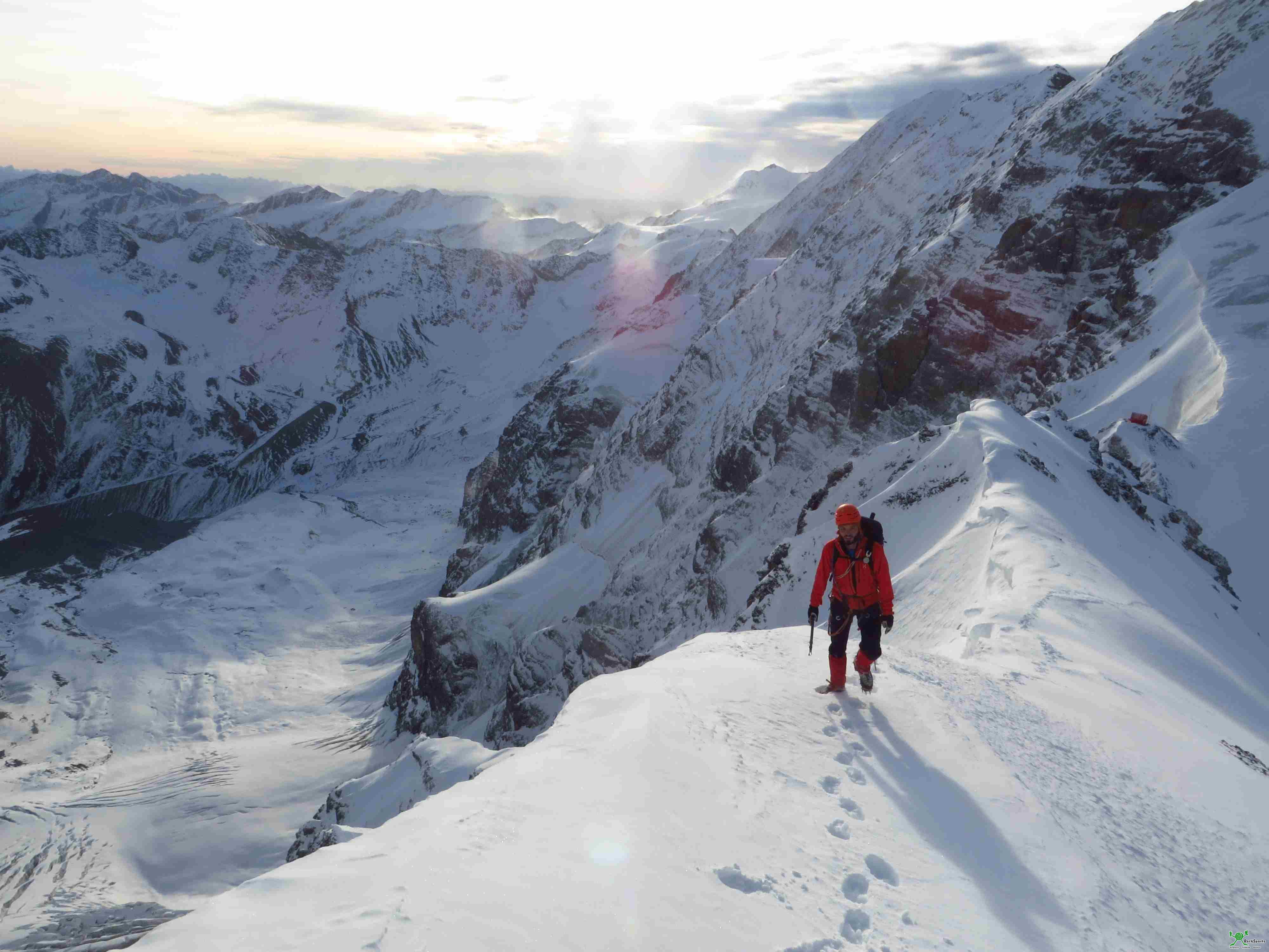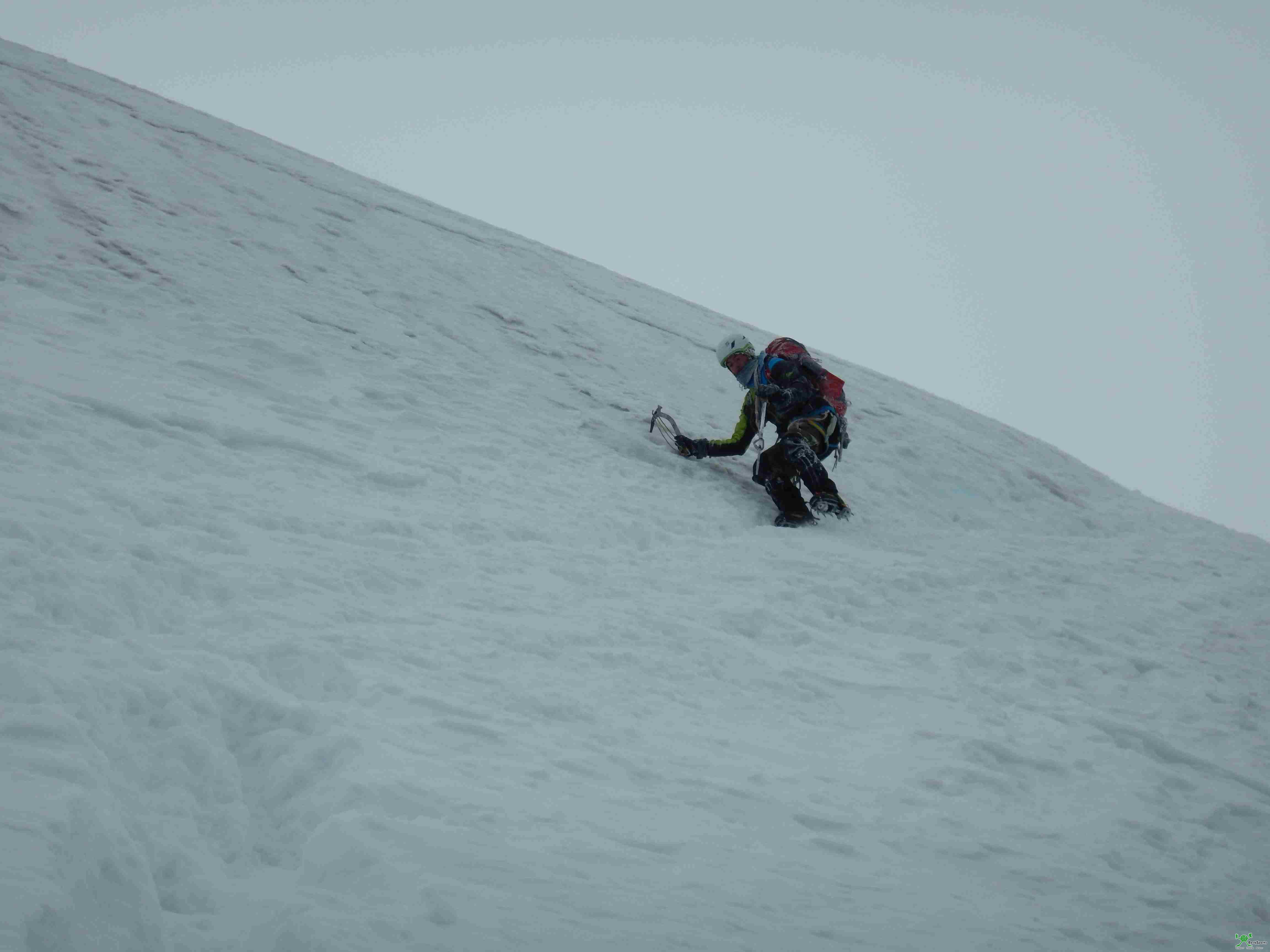 Den Ostgipfel lassen wir in anbetracht der forgeschrittenen Uhrzeit links liegen. In Richtung Westgipfel (3740m) bewegen wir uns teils auf dem meist Schneebedeckten Grat, teils in der etwa 50° Steilen Nordwestwand.