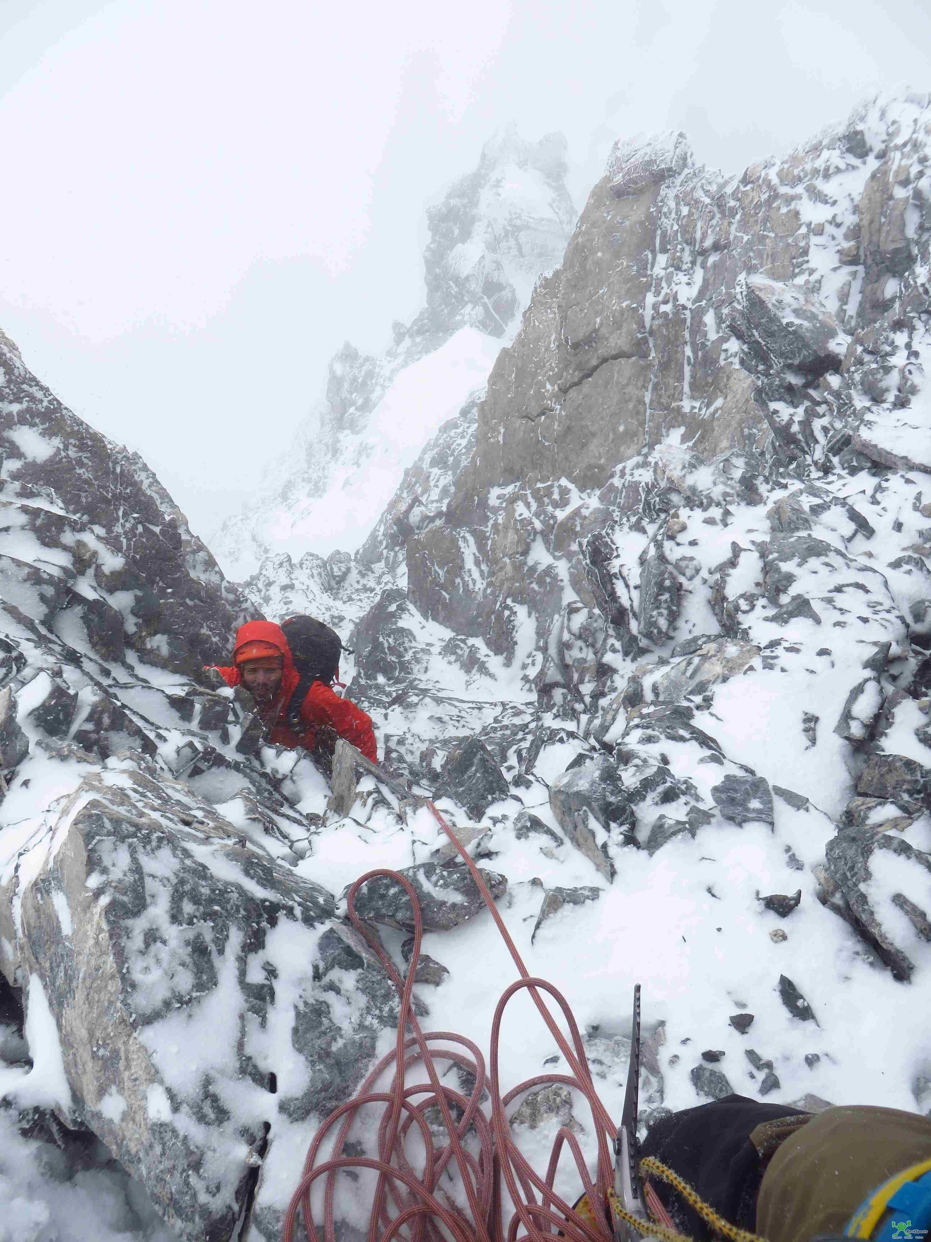 In der zweiten Hälfte des Grates gehts dafür noch mal richtig zur Sache. Steile Felstürme stellen sich in den Weg. Die leichteste Linie zu finden ist nicht immer einfach. Die Kletterei teilweise schwer und der Fels ist brüchiger als alles was ich bisher beklettern durfte. Spärliche Markierungen und sehr vereinzelte Bohrhaken unterstützen zumindest moralisch. Dafür ist es ziemlich windig und die Sicht wird zunehmend schlechter.