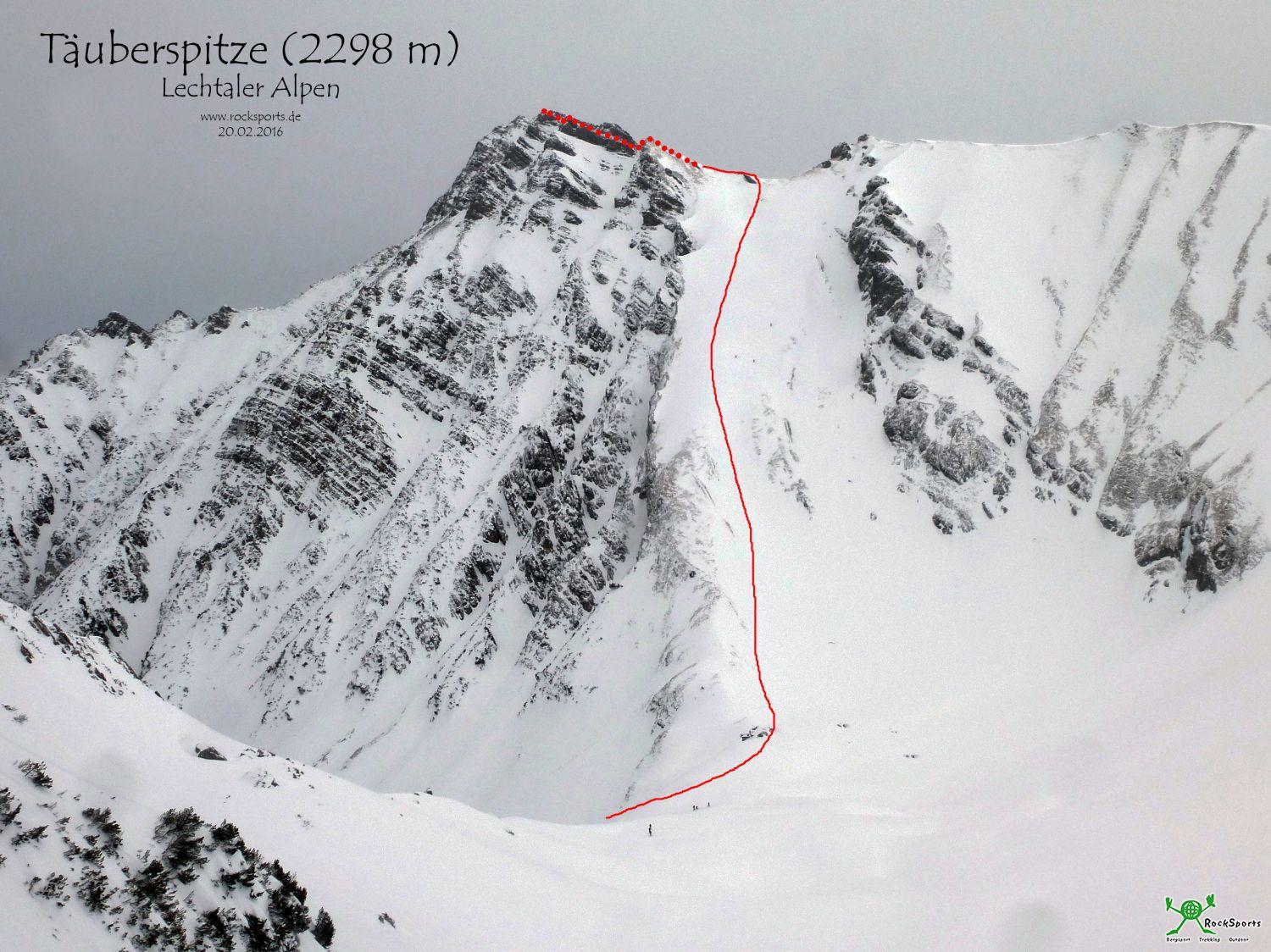 Letzten Samstag 20.02.16 vor einem weiteren, für die Mittagszeit angekündigten, markanten Wetterumschwung in diesem Winter ging es noch schnell ins Lechtal an die Täuberspitze und den Elmer Muttekopf in der Nähe von Namlos. Beide Gipfel sind für sich schon tolle Touren mit idealem Skigelände. Die Kombination von beiden, nahe aneinander gelegen Zielen, erweitert das Vergnügen noch und man kommt auf ca. 1600 Hm. Relativ spontan ist uns im Aufstieg noch die Nordflanke des Elmer Muttekopf ins Auge gestochen mit einer tollen Steilrinne durch felsdurchsetztes Gelände. Zunächst wollten wir es uns einfach mal anschauen, doch am Ende sind wir dann auch runter gefahren. Super war es und mit maximal 45° (wenige Stellen) nicht so steil wie zunächst vermutet…