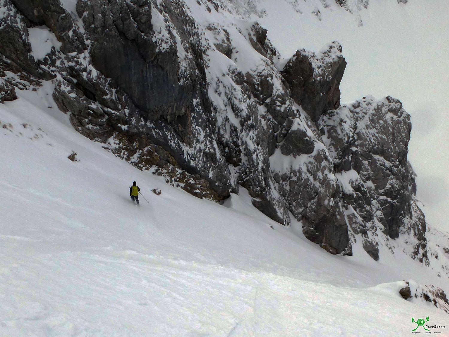 Von einem breiten Absatz im Muttekopf Ostrücken, etwas unterhalb der oben beschriebenen Steilstufe unterm Gipfelplateau ließ sich die Nordflanke mit der, von oben offensichtlichen, Nordrinne „Lange Gonde“ gut einsehen und wir entscheiden uns reinzufahren. Es lag gut gesetzter, tiefer Pulverschnee und wir hatten ein gutes Gefühl. Im Mittelteil der Rinne ist es am steilsten mit wenigen stellen max. 45°. Ansonsten überwiegend etwas mehr wie 40°, an der Einfahrt ca. 35°. Alle Angaben zur Steilheit stellen Schätzungen und keine Messungen dar. Insbesondere die 45° Stellen waren Geländeabsätze und somit stark Schneehöhenabhängig.