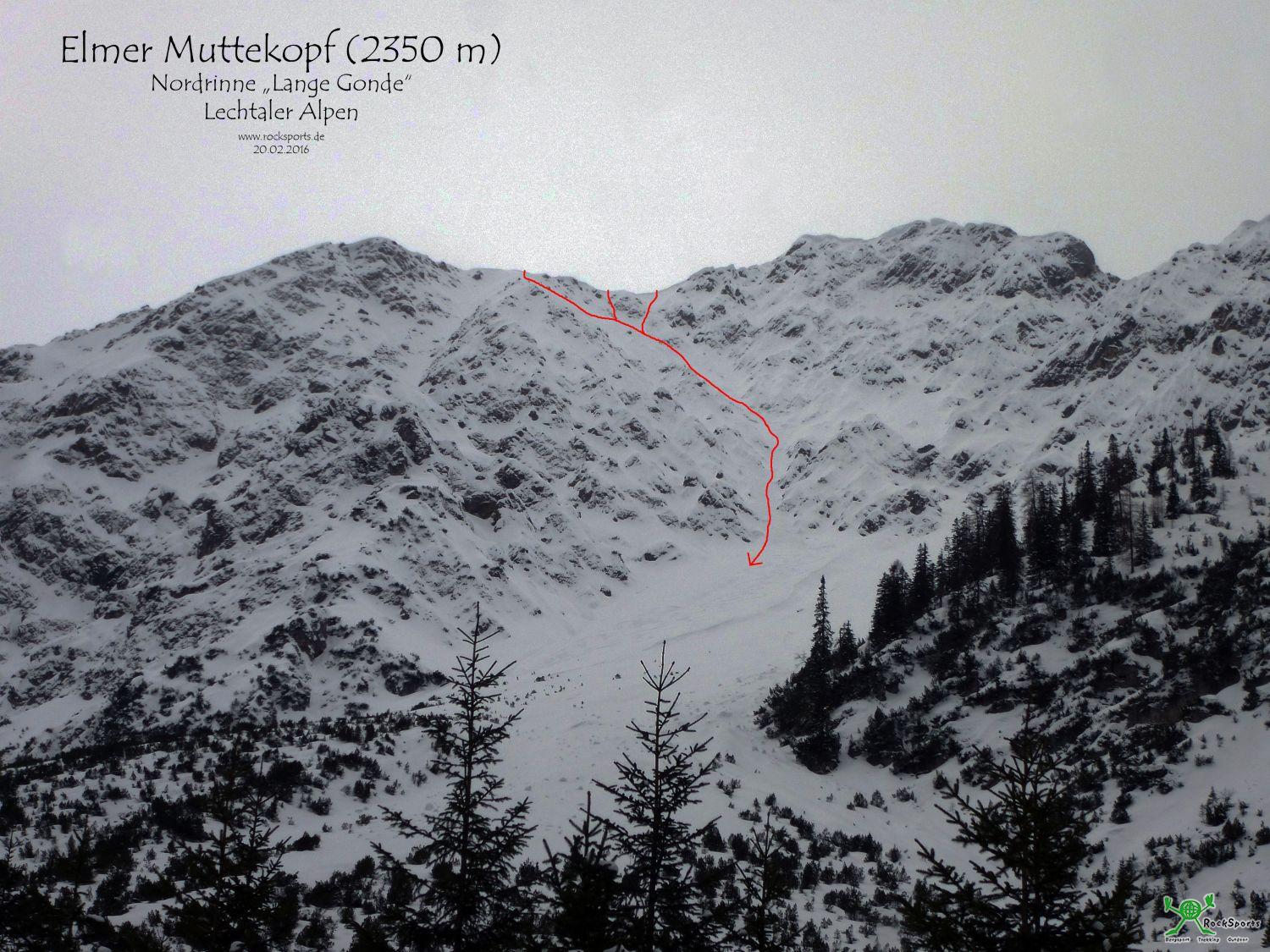 Von dieser Rinne habe ich noch nie was gehört, gesehen oder gelesen. In der AV-Karte wird das Gelände unterhalb der Elmer Muttekopf Nordflanke als „Lange Gonde“ benannt. So habe ich diese Nordrinne nun hier im Bericht auch mal als „Lange Gonde“ getauft.