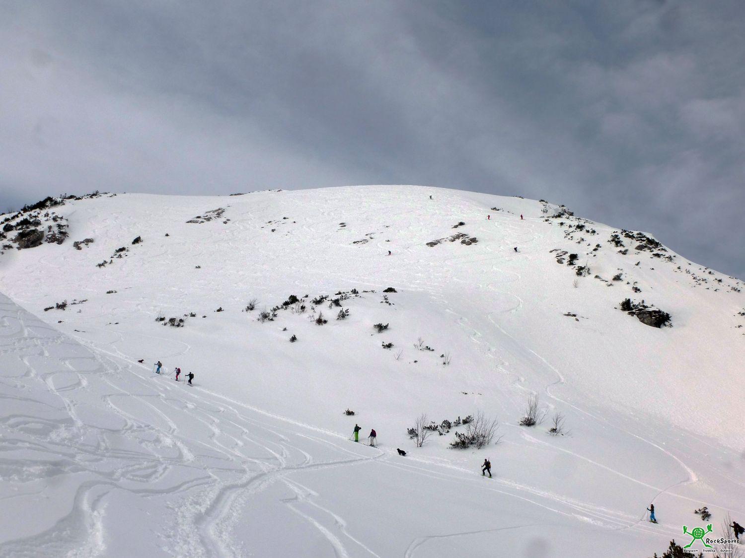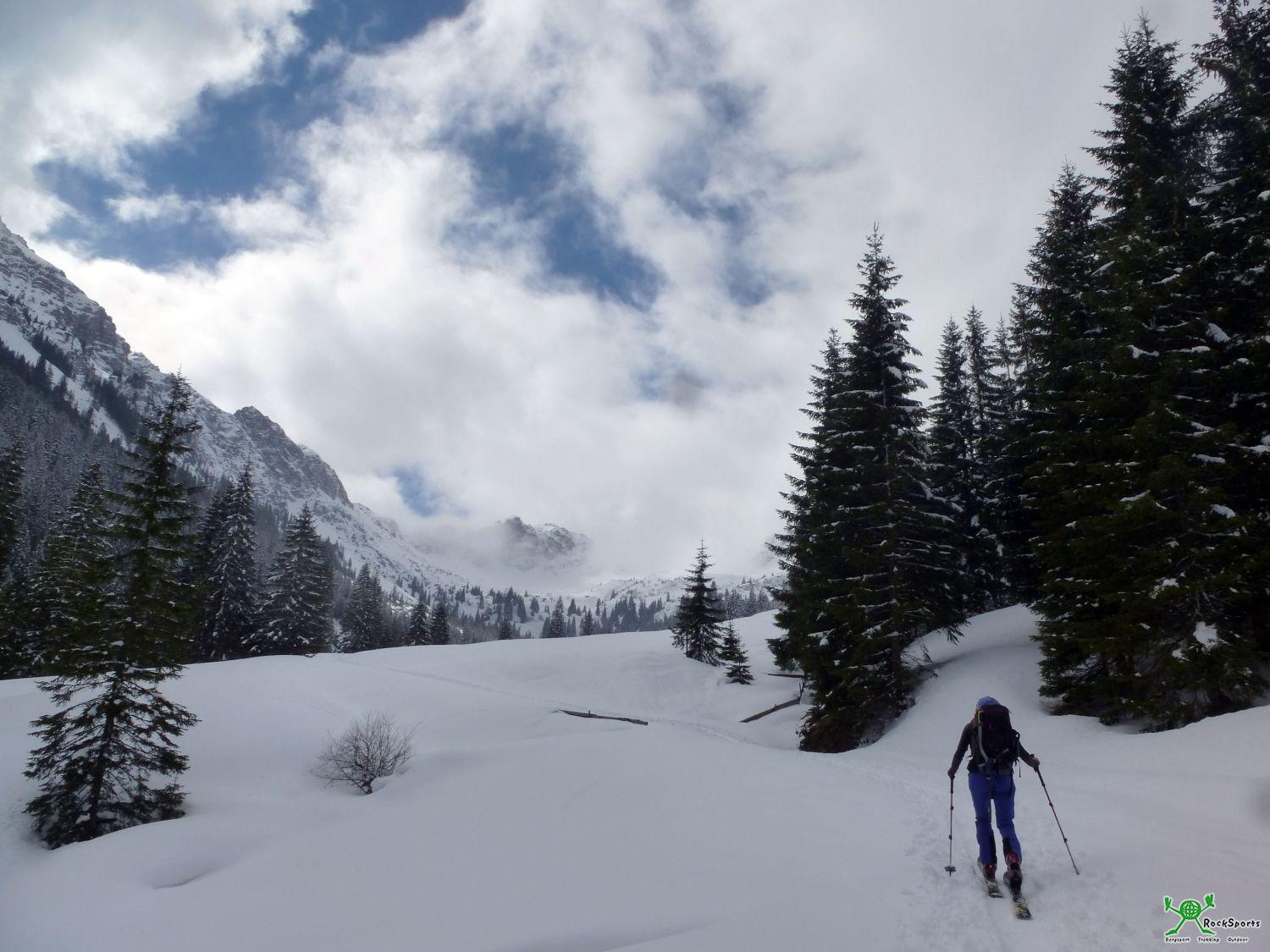 Noch zwei weitere Tourengeher sind unserer Spur über den namenlosen Gratrücken im Birkental gefolgt und zwei kamen noch vom Vilsalpsee herauf. So sind es also 9 Personen im Winterraum. Die Lust, am nächsten Morgen weitere Touren im Umfeld der Hütte anzugehen, hält sich nach den Ereignissen bei allen in Grenzen und der direkte Rückweg in der Spur von gestern wird angegangen. Zurück in der Strindenscharte nehmen wir noch die Sulzspitze kurz mit. Vom Haldensee her ist hier auf dieser Modetour ganz schön was los und viele Leute sind unterwegs. Hochbetrieb am Ostersonntag.