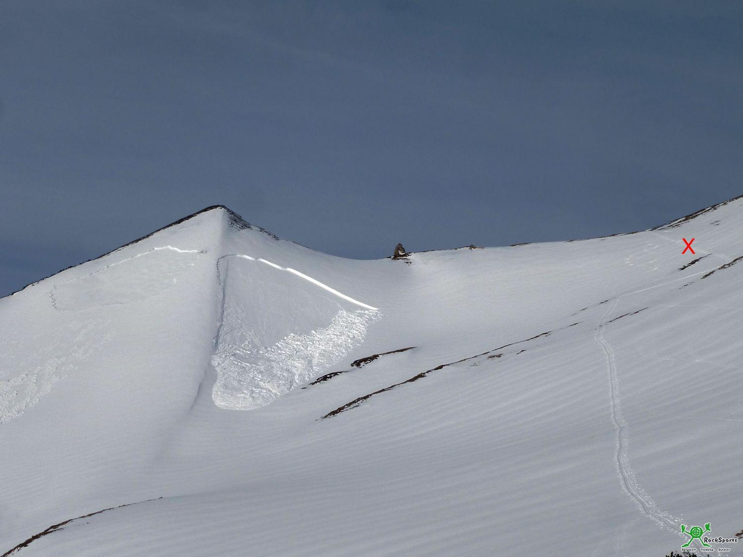 3. Lawinenabgang südöstlich unterhalb der Schochenspitze (ohne Personenbeteiligung) – das rote Kreuz stellt meinen Standpunkt während der Fernauslösung dar.
