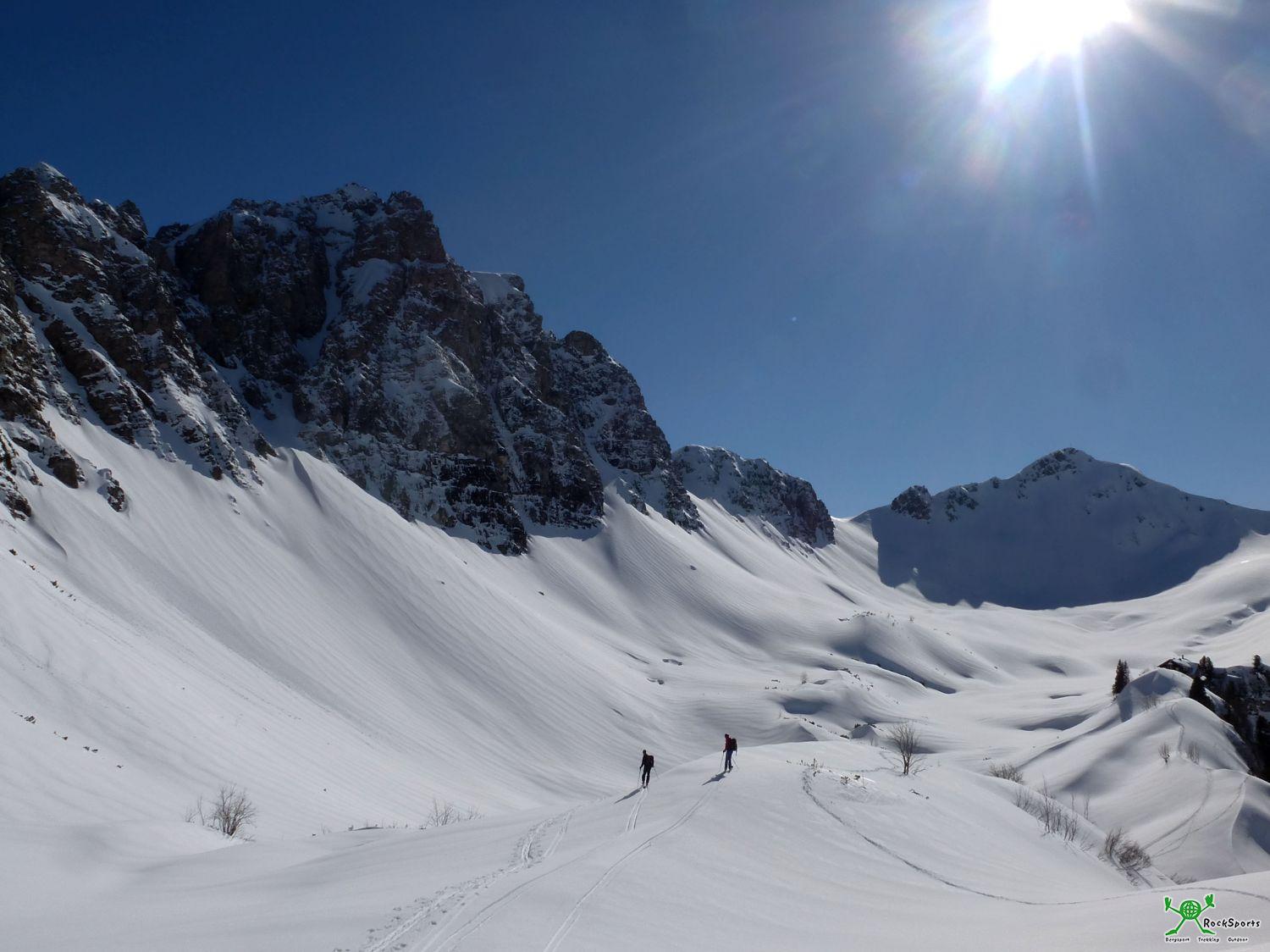 Den kurzen Abstecher zur Schochenspitze (2069 m) über gutverfirnte Südhänge lassen wir uns trotz Schrecksekunden nicht nehmen. Anschließend geht es über mäßig geneigte Südwesthänge der Landsberger Hütte entgegen.