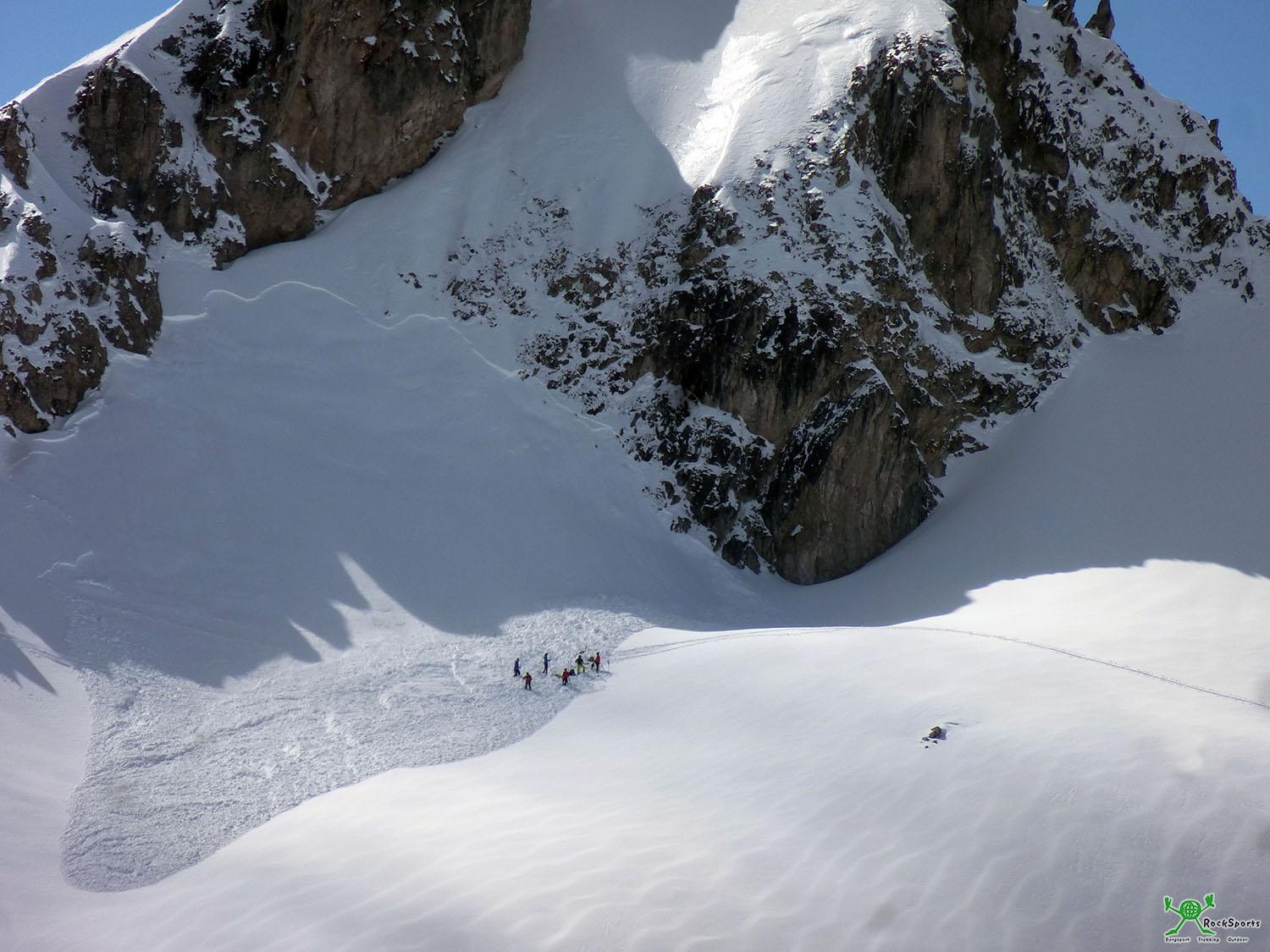 Von der Strindenscharte queren wir nun in der Südflanke der Sulzspitze Richtung Gappenfeldscharte und Schochenspitze. Kurz vor der Gappenfeldscharte sehen wir dann schon die nächste Lawine. In den Nordosthängen der Schochenspitze ist ein Schneebrett abgegangen. Aus der Entfernung sehen wir einige Personen die auf dem Lawinenfeld zu Gange sind. Es ist aber nicht zu erkennen was genau sie machen. Gerade als ich mich aufmache um zur Hilfe rüber zu Rennen, kommen zwei abgefahren und geben Entwarnung, dass die verschüttete Person wieder befreit ist und alles halbwegs Ok ist. Das folgende Bild ist voll her gezoomt und die eigentliche Entfernung zu unserem Standpunkt ist nicht zu erkennen.