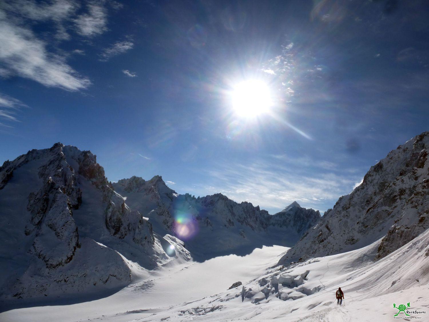 Um die Aussicht und die tolle Inversions Lage zu genießen fehlt leider etwas die Zeit, zumal wir ja noch ein bisschen was vor haben. Mit Vollgas geht es also unterhalb der Nordwände von Aiguille Verte und Droites auf den Argentieregletscher runter und wir stehen so gegen 09:45 Uhr unten am Gletscher unter der Courtes Nordwand. Schon nach dieser Abfahrt war klar, dass es ganz ordentlich Neuschnee gegeben hat.
