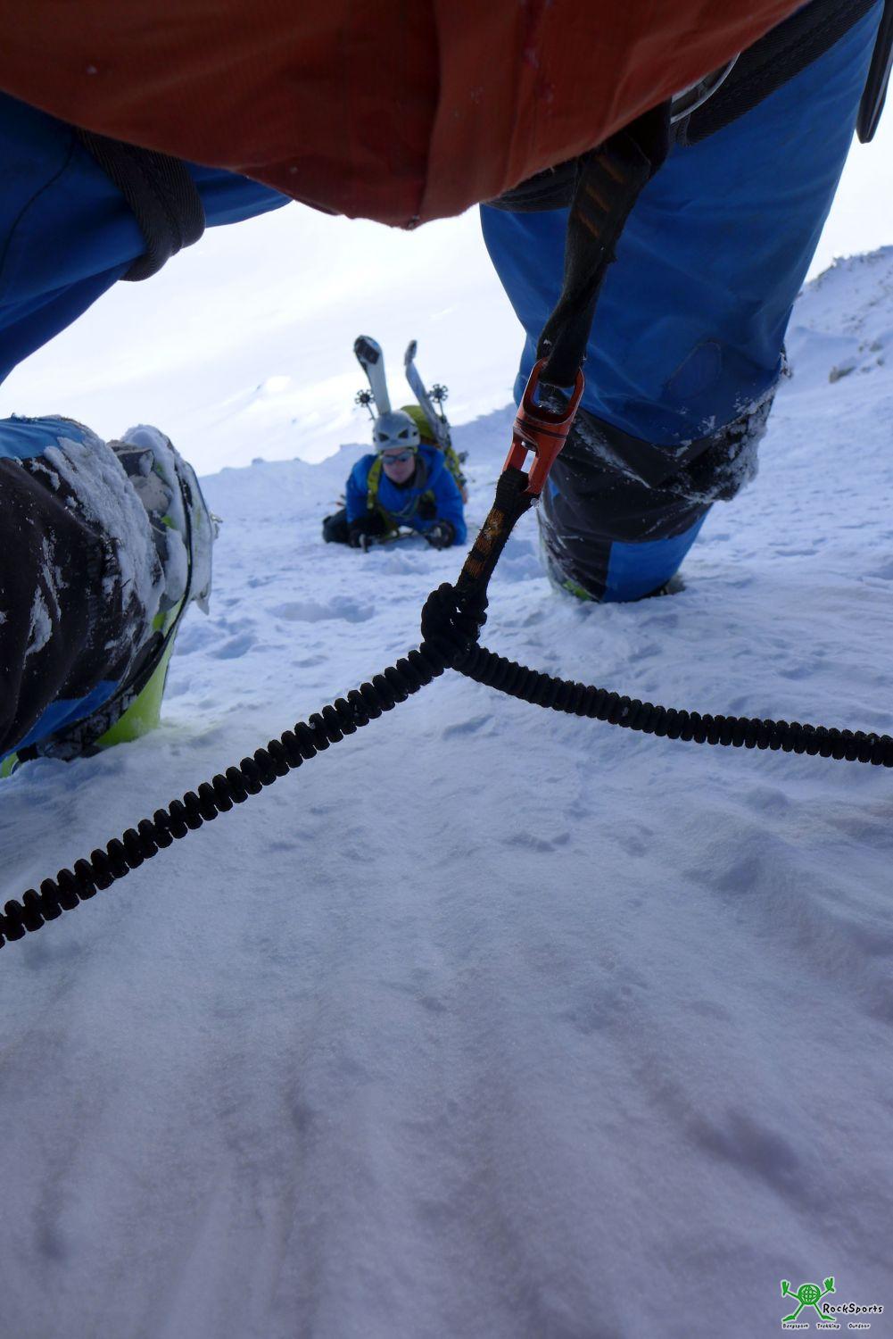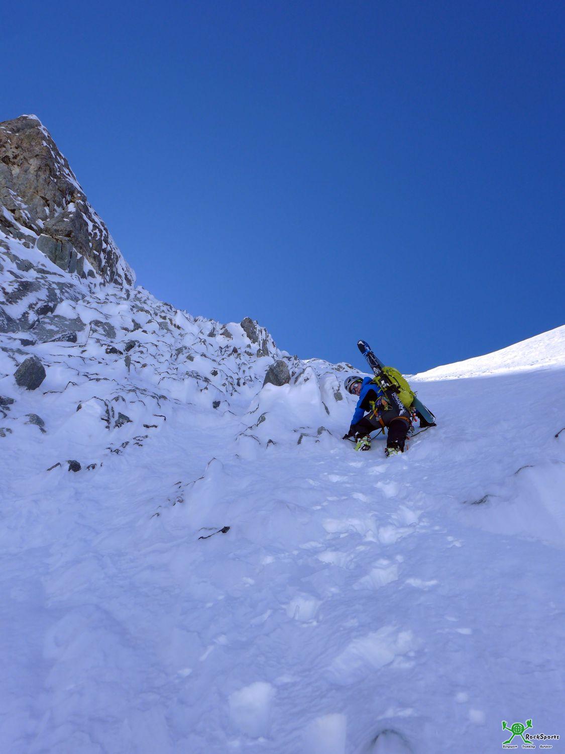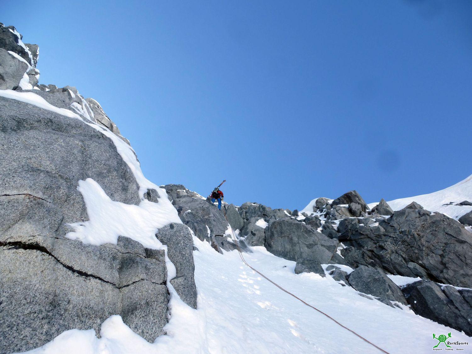 Es folgt eine lange Passage mit leichtem Gelände (max. 50°) bis im Mittelteil ein ausgeaperter kurzer Felsgürtel wartet. Nach 30 m am Seil und wenigen Cams liegt der ausgeaperte Felsgürtel hinter uns. Auf dem Übersichtsbild ganz oben im Bericht ist diese Passage übrigens wegen dem vielen Schnee kaum auszumachen.