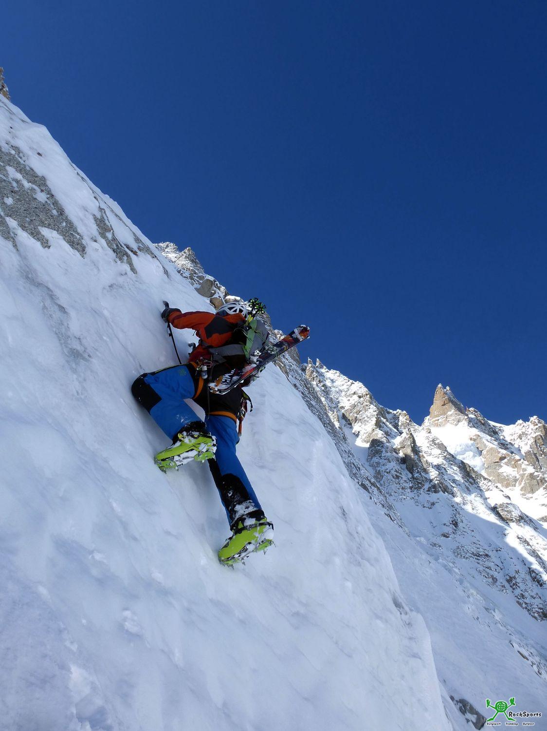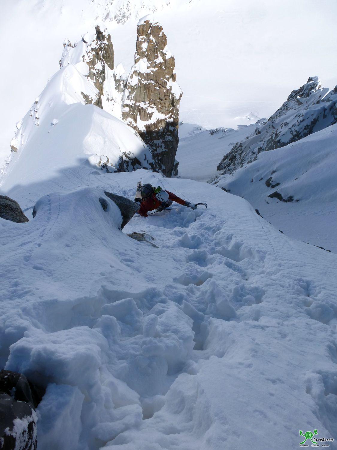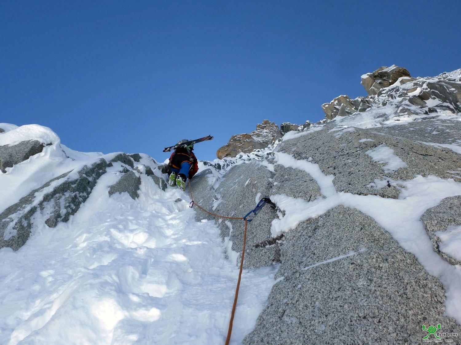 Es folgt eine lange Passage mit leichtem Gelände (max. 50°) bis im Mittelteil ein ausgeaperter kurzer Felsgürtel wartet. Nach 30 m am Seil und wenigen Cams liegt der ausgeaperte Felsgürtel hinter uns. Auf dem Übersichtsbild ganz oben im Bericht ist diese Passage übrigens wegen dem vielen Schnee kaum auszumachen.
