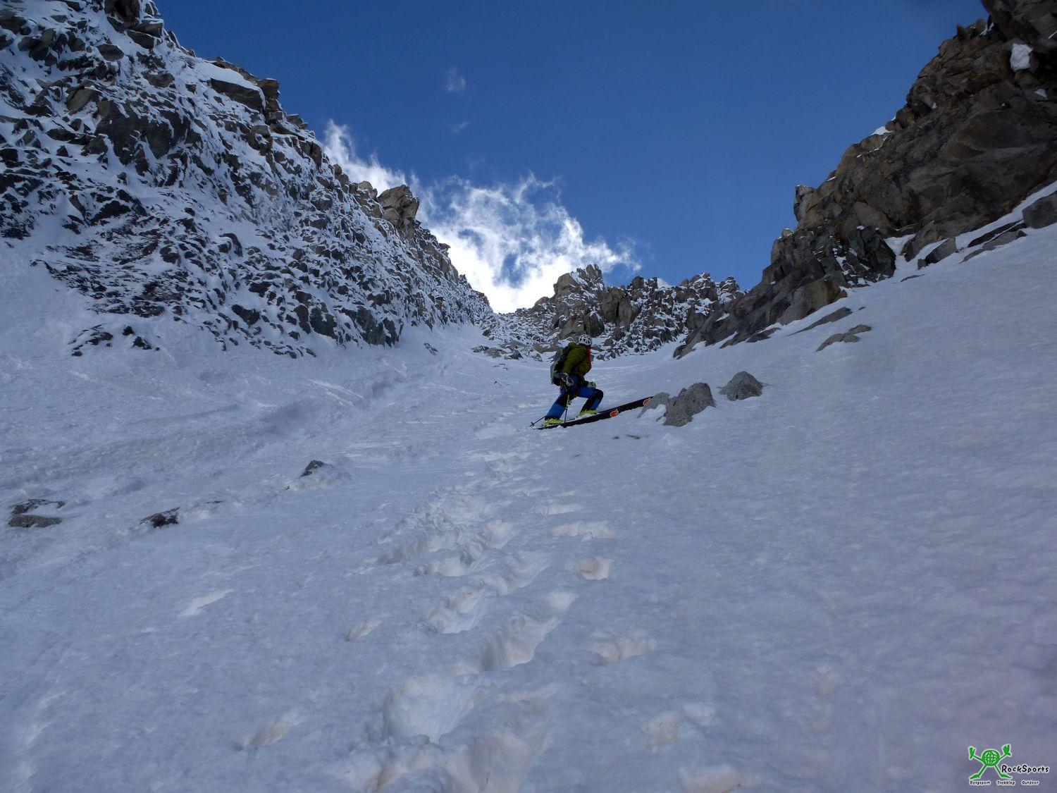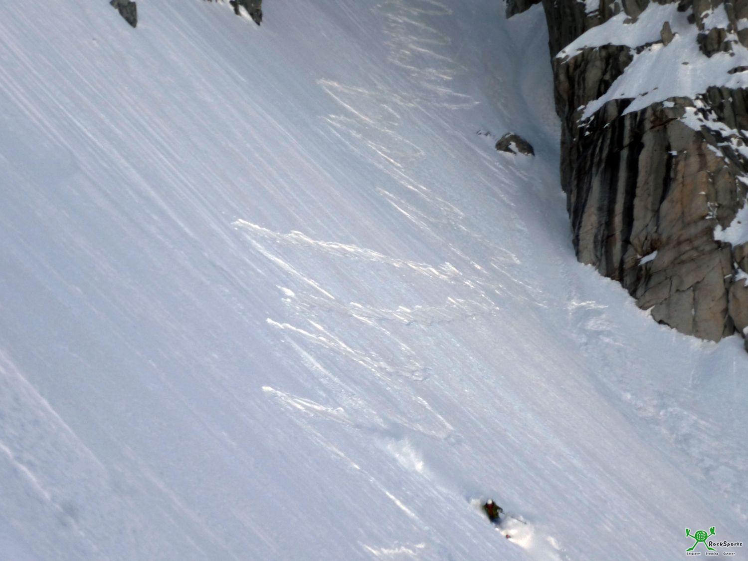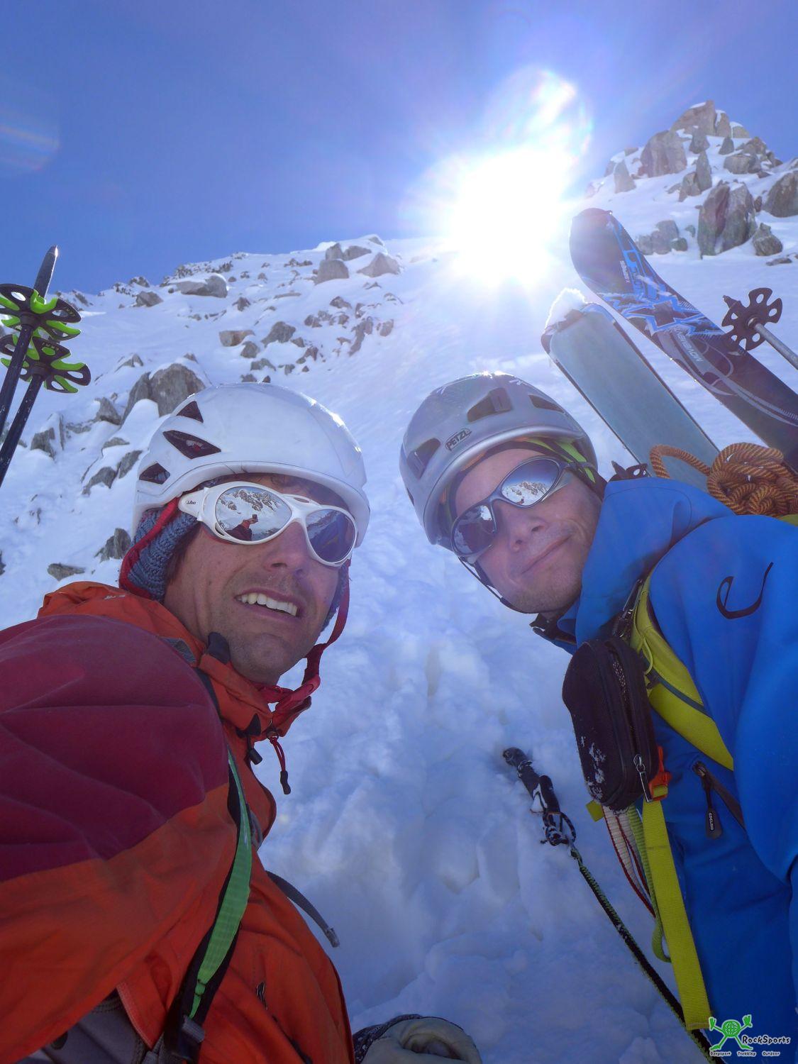 Nun ist natürlich ein Rückzug aus der Courtes Nordwand 100 Hm unterm Gipfel nicht so ganz einfach wenn einem der Weg nach oben versperrt ist. Abstieg über die Route? Möglich, aber aufwendig wegen einem kurzen Mixedteil und kleineren Eisaufschwüngen im unteren Teil. Abstieg über die Schweizerführe? Bei den aktuellen stark ausgeaperten Verhältnissen sicher auch nicht lustig. Doch was ist das. Wir können weit unten Skispuren vom heutigen Tag erkennen, welche in die „Cordier Route“ hinein führen. Die Ski haben wir ja eh am Rücken, da wir normalerweise über die Courtes NO Flanke abfahren wollten. Warum also nicht über eine noch etwas anspruchsvollere Steilabfahrt den Rückzug antreten. Viele andere Möglichkeiten hätte es eh nicht gegeben. So Seilen wir zunächst eine Seillänge ins “Gabarrou 2 Couloir” ab, fahren über dieses Couloir nach unten und treffen später auf die „Cordier Route“ und die dortigen Spuren. Der zunächst vorhandene große innerliche Ärger über den Abbruch war mit dieser genialen Steilabfahrt wieder etwas gelegt.