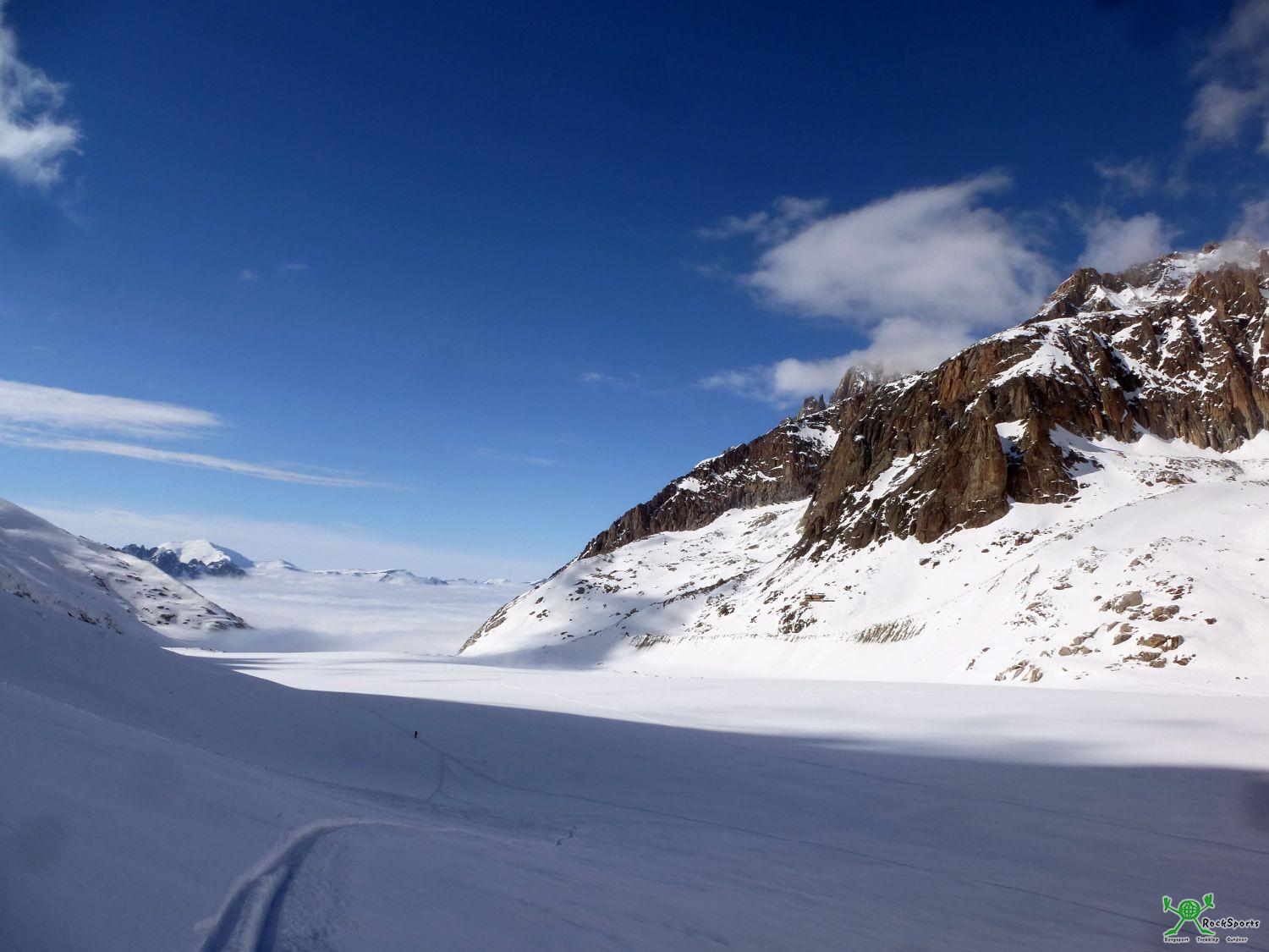 über die Weiten des Argentieregletscher dem Nebel entgegen.